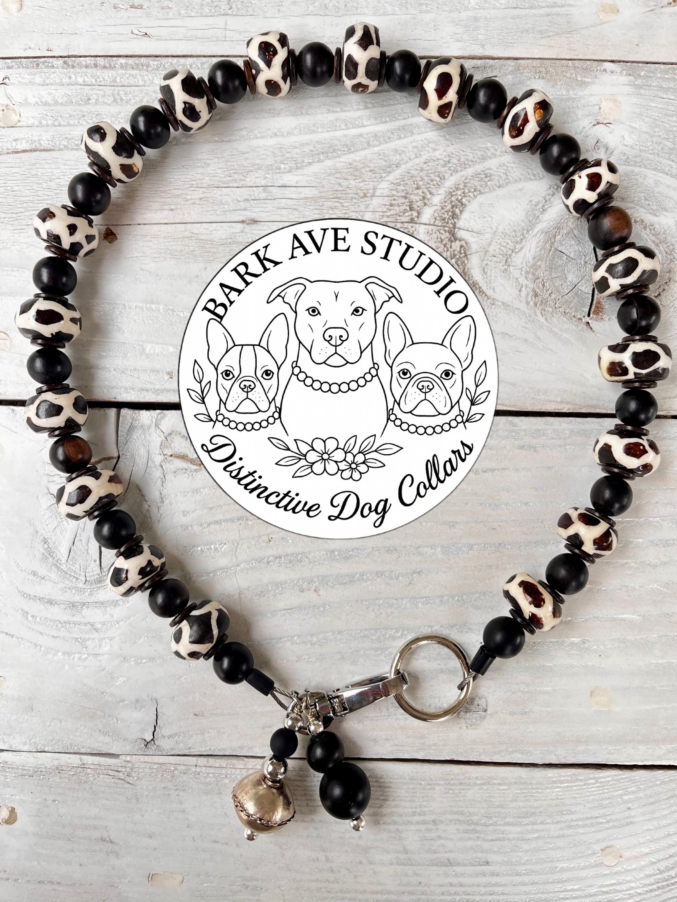Make a bold statement with our Cowhide Charm Beaded Dog Collar – a one-of-a-kind accessory for the stylish pup. This handcrafted collar features a striking blend of black African Batik cow bone beads, dark wood accents, and chunky cowhide-print focal beads. Finished with a fancy stainless steel clasp and decorative charms, it’s both functional and fashionable.