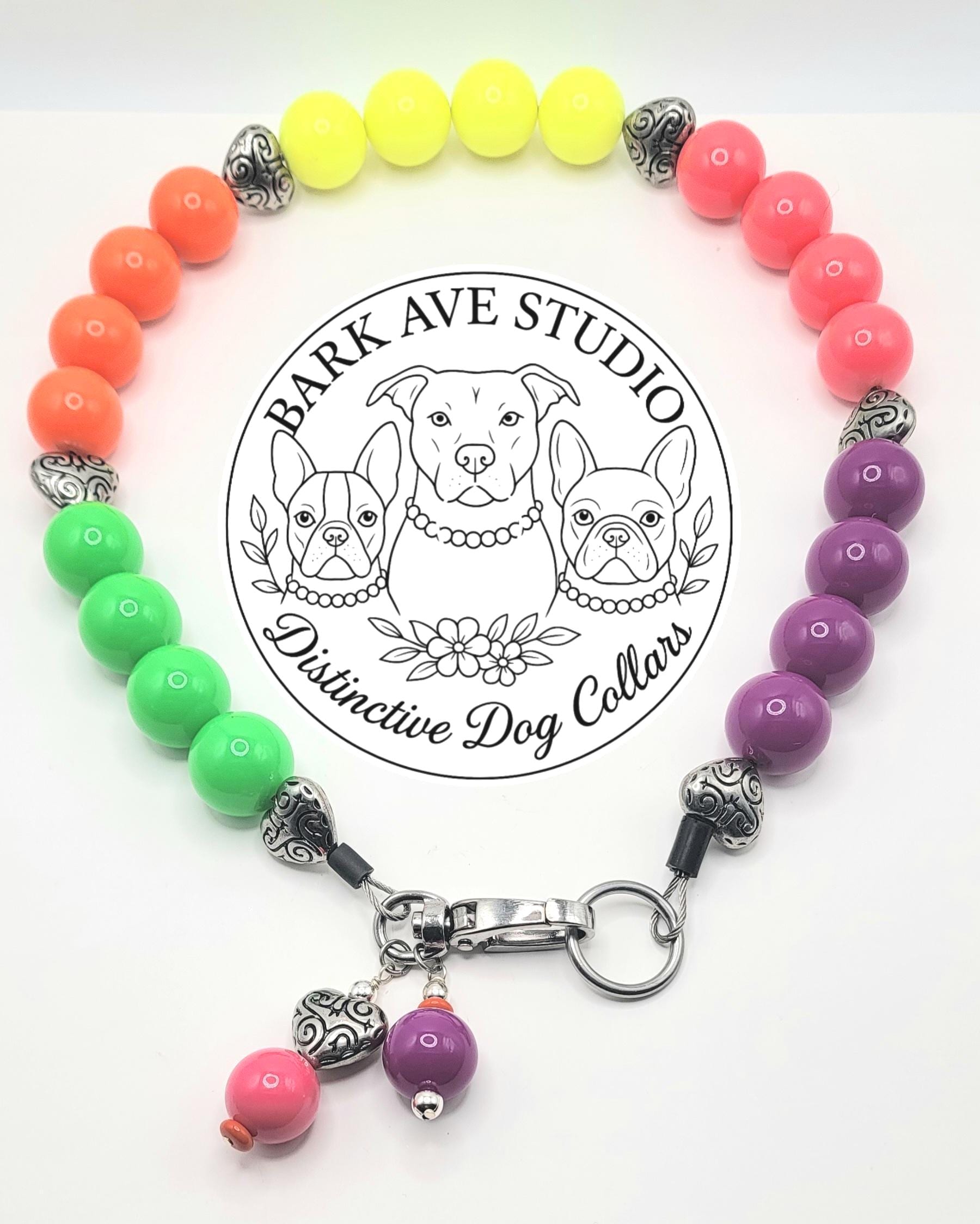 Bright, bold, and full of personality – this rainbow glow dog collar from Bark Ave Studio is the ultimate statement piece for your stylish pup. Featuring vibrant neon beads in a full spectrum of colors, elegant stainless steel heart spacers, and matching bead dangles.