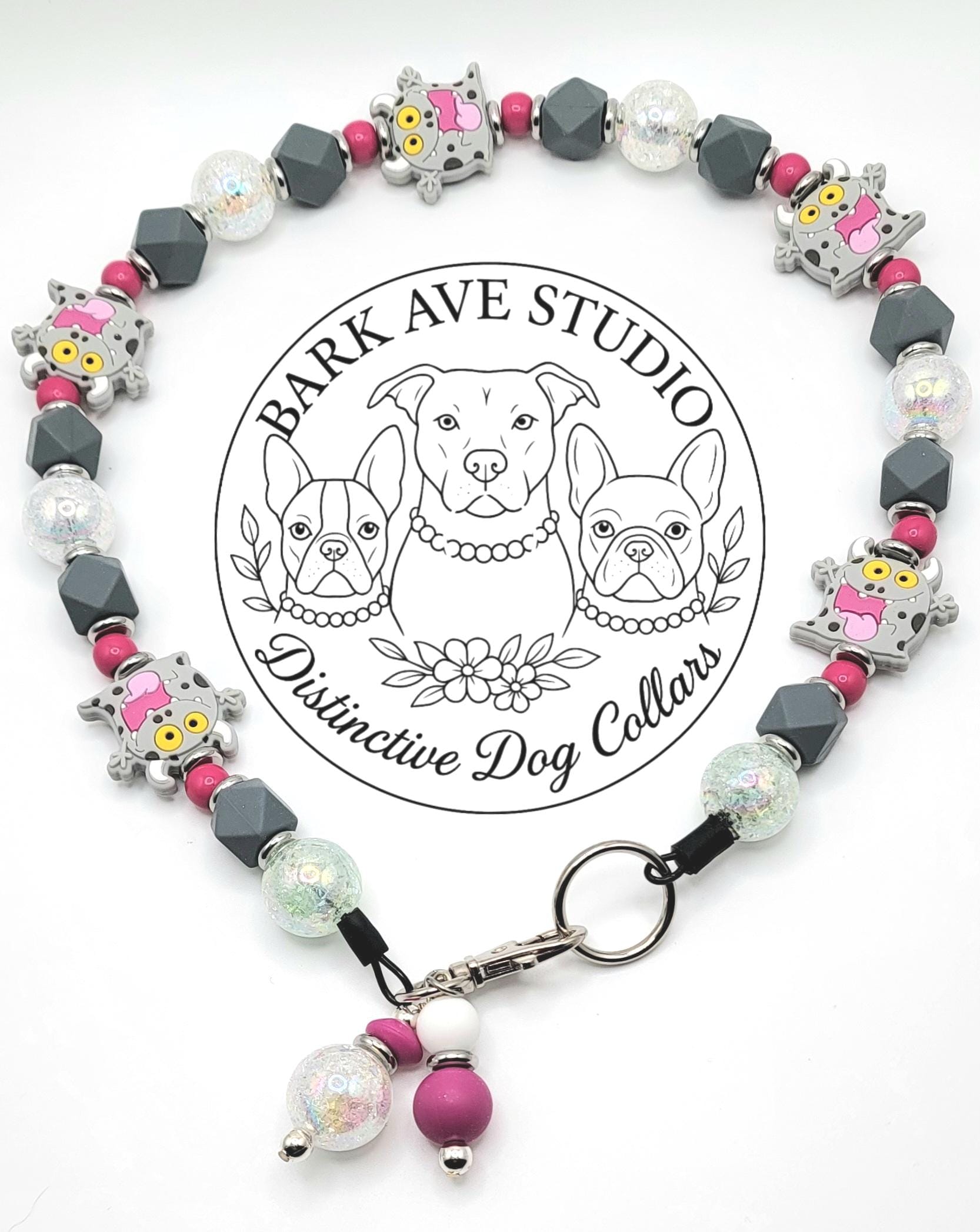 Add a pop of fun to your pup’s style with this playful cartoon monster dog collar from Bark Ave Studio! Featuring whimsical character beads, vibrant hot pink accents, shimmering bubble-like beads, and modern gray hexagons, this collar makes a bold and adorable statement. Perfect for everyday wear, photo shoots, or special occasions, it’s a must-have for pups who love to stand out.