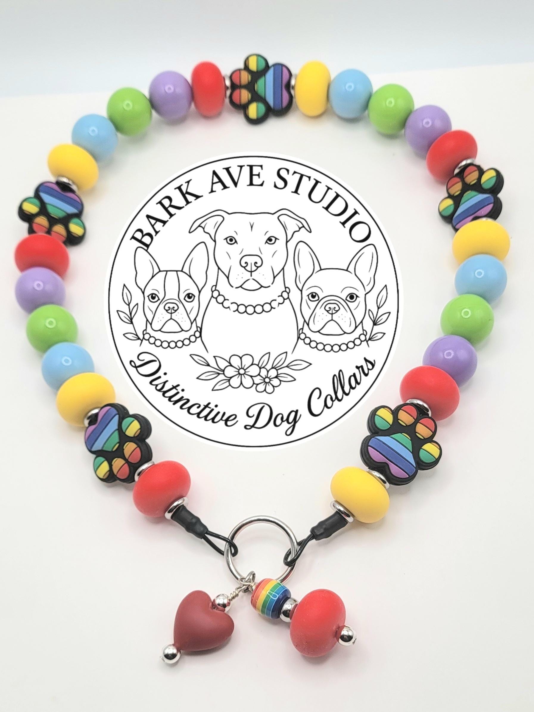 Celebrate love, diversity, and your pup’s vibrant personality with this eye-catching Rainbow Dog Collar from Bark Ave Studio! Featuring bold rainbow paw print charms and brightly colored acrylic & silicone beads, this statement piece brings joy and color to any occasion—whether it’s Pride month, a pup birthday party, or just a fabulous walk around the block.