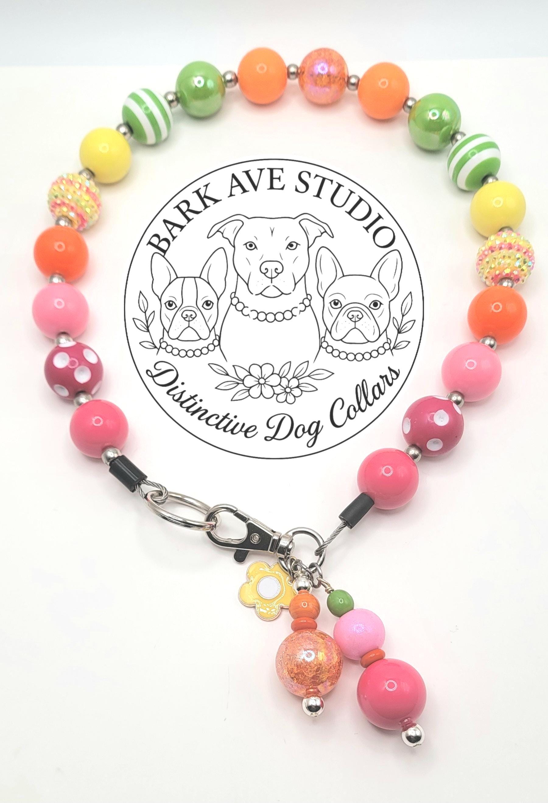 Bring the fun wherever your pup goes with our Color Pop Beaded Dog Collar – a bold blend of neon beads, striped accents, and retro charm! This handcrafted collar is a wearable work of art, featuring vibrant hot pinks, juicy oranges, zesty greens, and sunshine yellows. Finished with whimsical polka dots and a dangling flower charm, this collar is perfect for the dog who lives loud and plays proud.