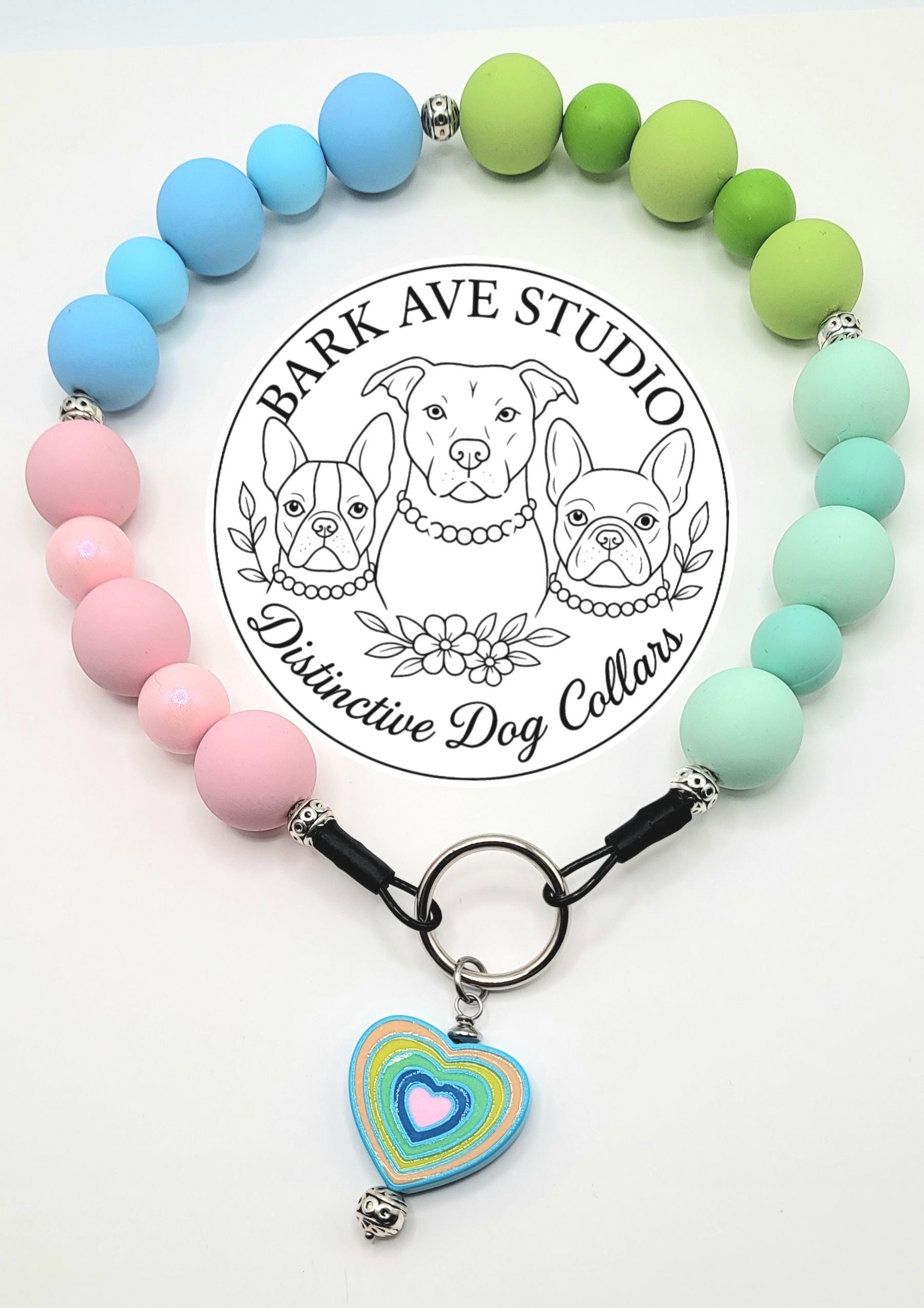 Brighten your pup’s style with this Rainbow Heart Charm Beaded Dog Collar from Bark Ave Studio! Featuring chunky silicone beads in playful Ombre tones of pink, blue, mint, and lime green, this collar adds a splash of joy to every walk. A whimsical layered heart charm gives it that extra flair, while the durable construction ensures it’s as functional as it is fashionable.