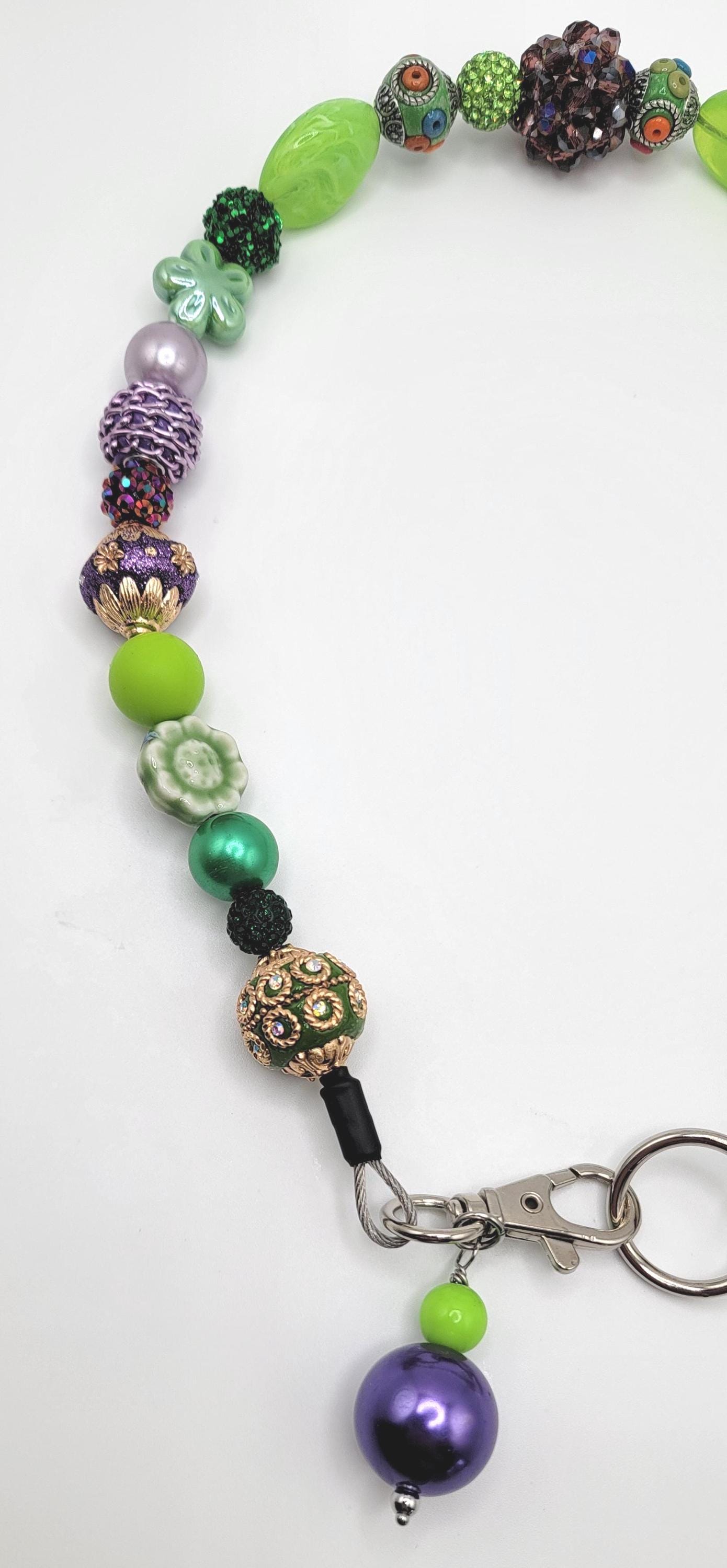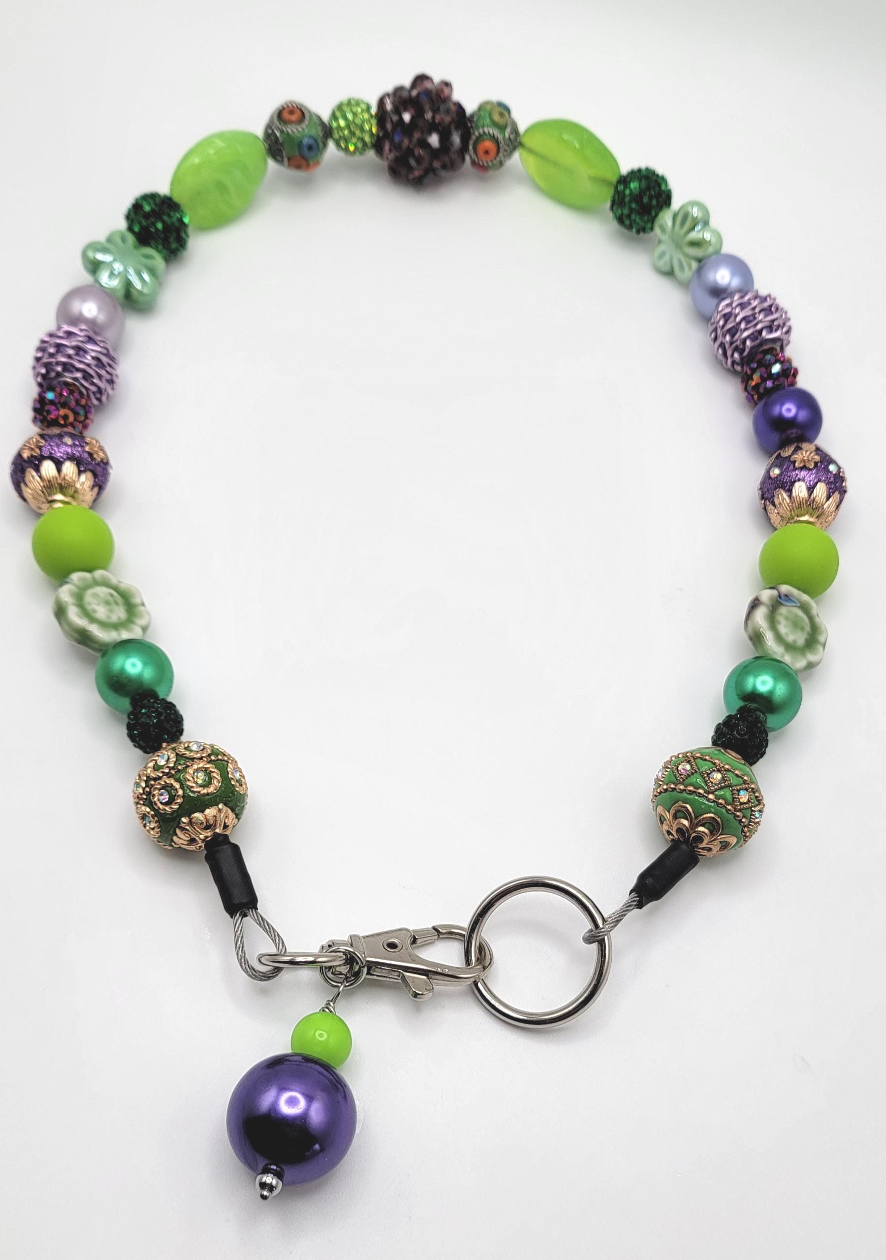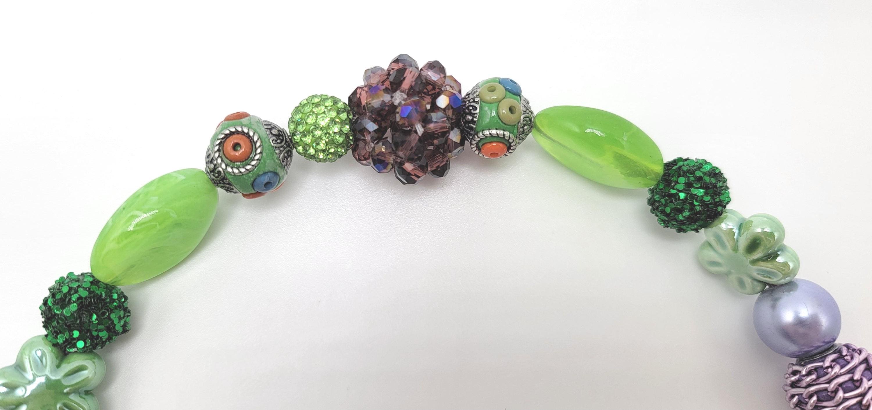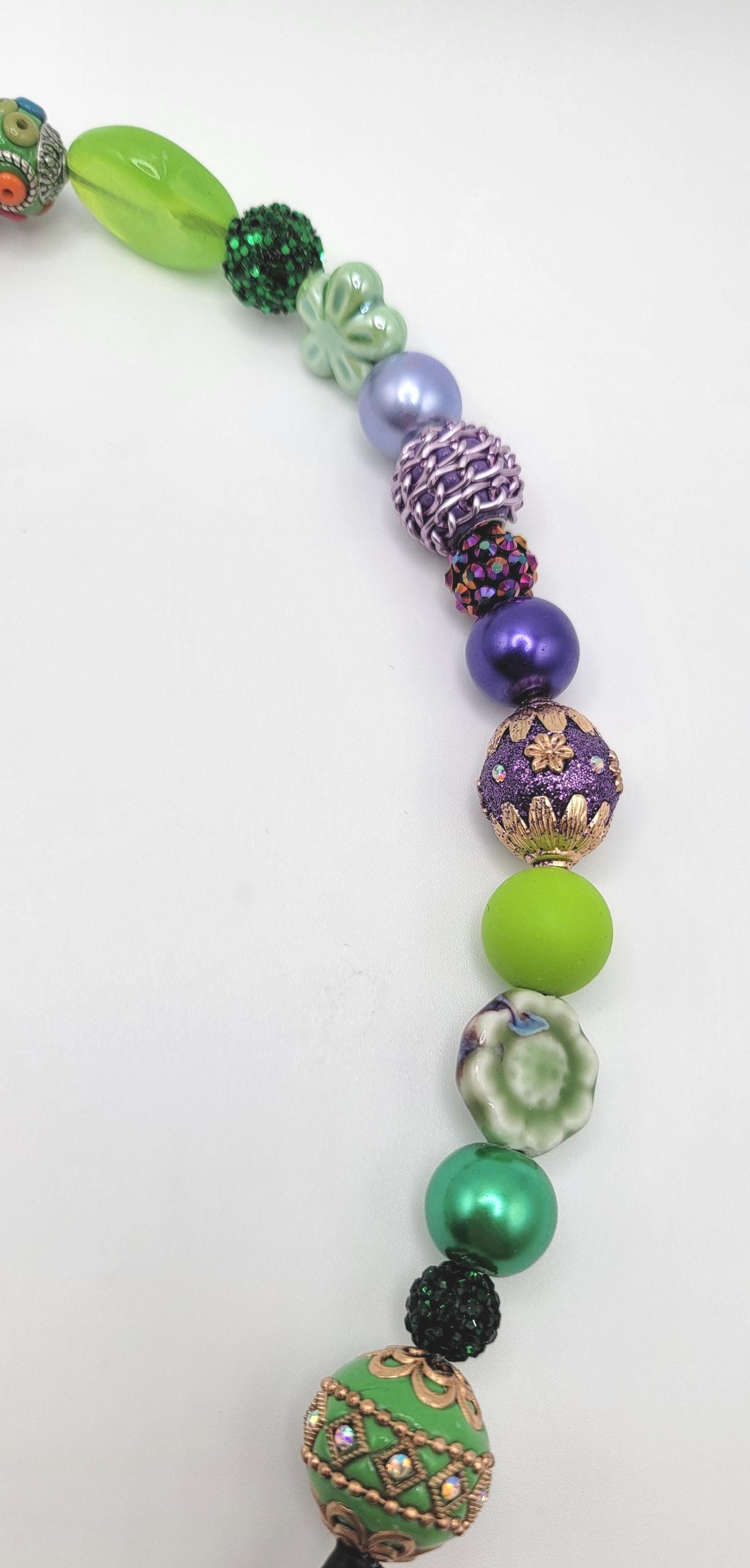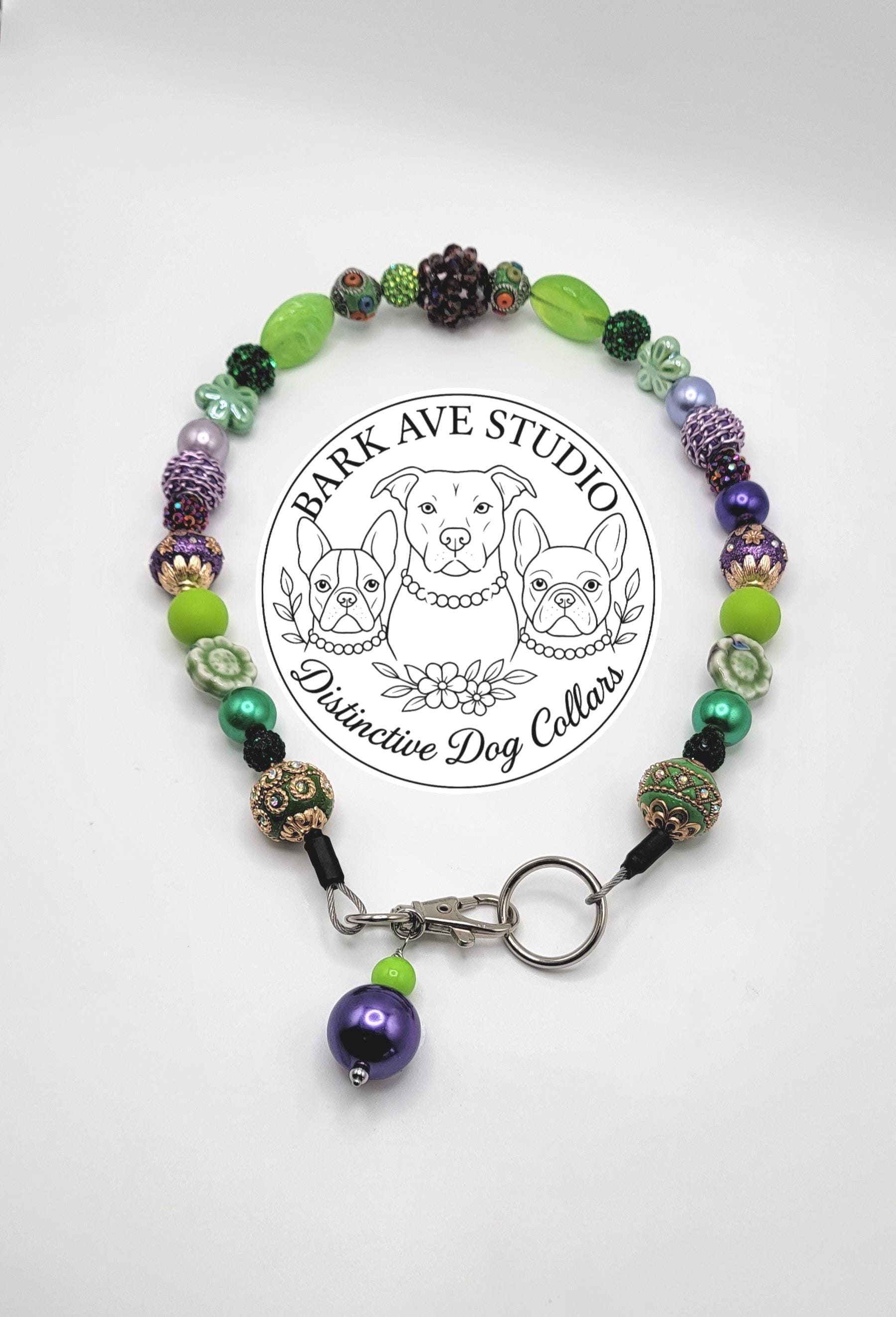 Celebrate your pup’s vibrant spirit with this one-of-a-kind Mardi Gras-inspired dog collar from Bark Ave Studio! Featuring hand-selected beads in shimmering shades of green, purple, and gold, this distinctive dog necklace adds a festive, playful touch to your dog’s style. Every bead is carefully chosen for maximum sparkle and character, including floral ceramics, glitter rounds, rhinestone-studded gems, and bright neon accents.