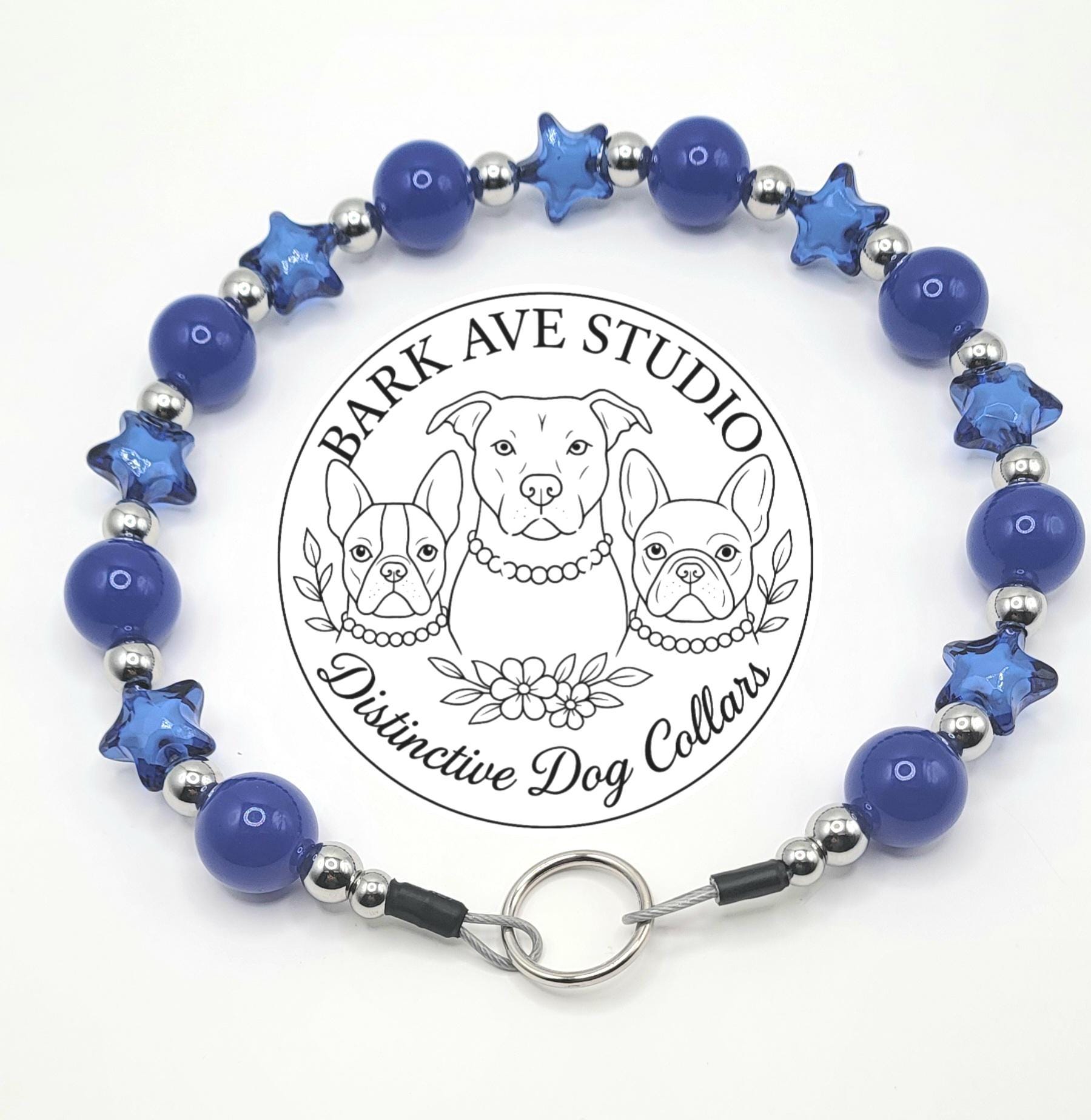 Bring out your pup’s bold side with our Midnight Starburst Dog Collar, a Bark Ave Studio original designed for standout style. This handmade beaded collar features deep sapphire blue beads paired with shimmering acrylic star charms for a celestial, show-stopping look. Each bead is separated by polished silver spacers, creating a luxe finish that’s both eye-catching and lightweight for everyday wear.