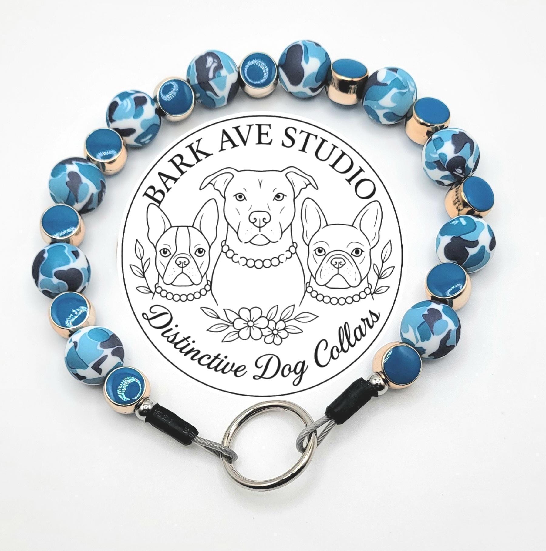 Elevate your dog’s collar game with this one-of-a-kind handcrafted piece from Bark Ave Studio. Featuring vibrant camo-patterned silicone beads in shades of ocean blue, sky blue, and white, this collar blends playful charm with boutique-level craftsmanship. Glossy aqua stainless steel spacer beads and camo silicone rounds to add a splash of modern flair and durability.