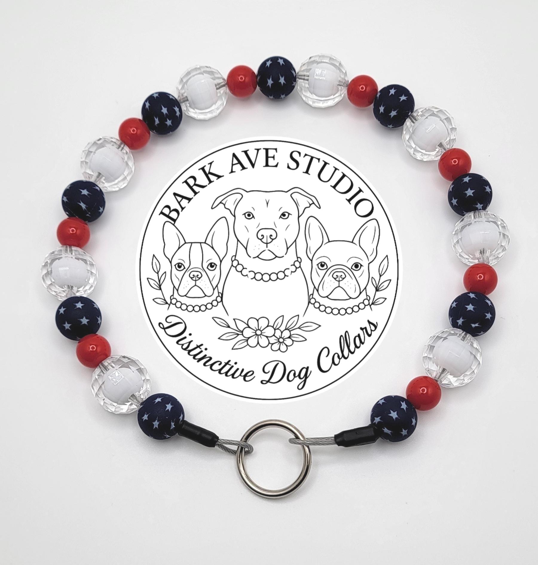 Let your pup strut their patriotic pride with the Red White & Woof Collar from Bark Ave Studio! This eye-catching beaded collar features a bold mix of glossy red rounds, translucent crystal-clear acrylics, and deep blue star-patterned Silicone beads—crafted to celebrate the spirit of the USA in style.