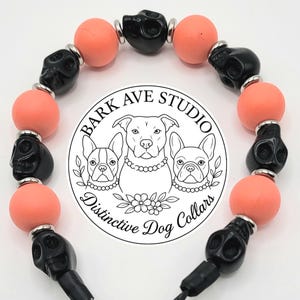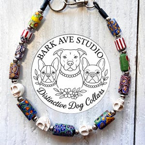 The Skull Candy Carnival Dog Collar brings bold energy with hand-carved wood skull beads, colorful striped African trade beads, and detailed stainless steel spacers for extra flair. Strung on durable coated stainless steel wire with secure hardware, it’s a vibrant statement piece for pups with personality.