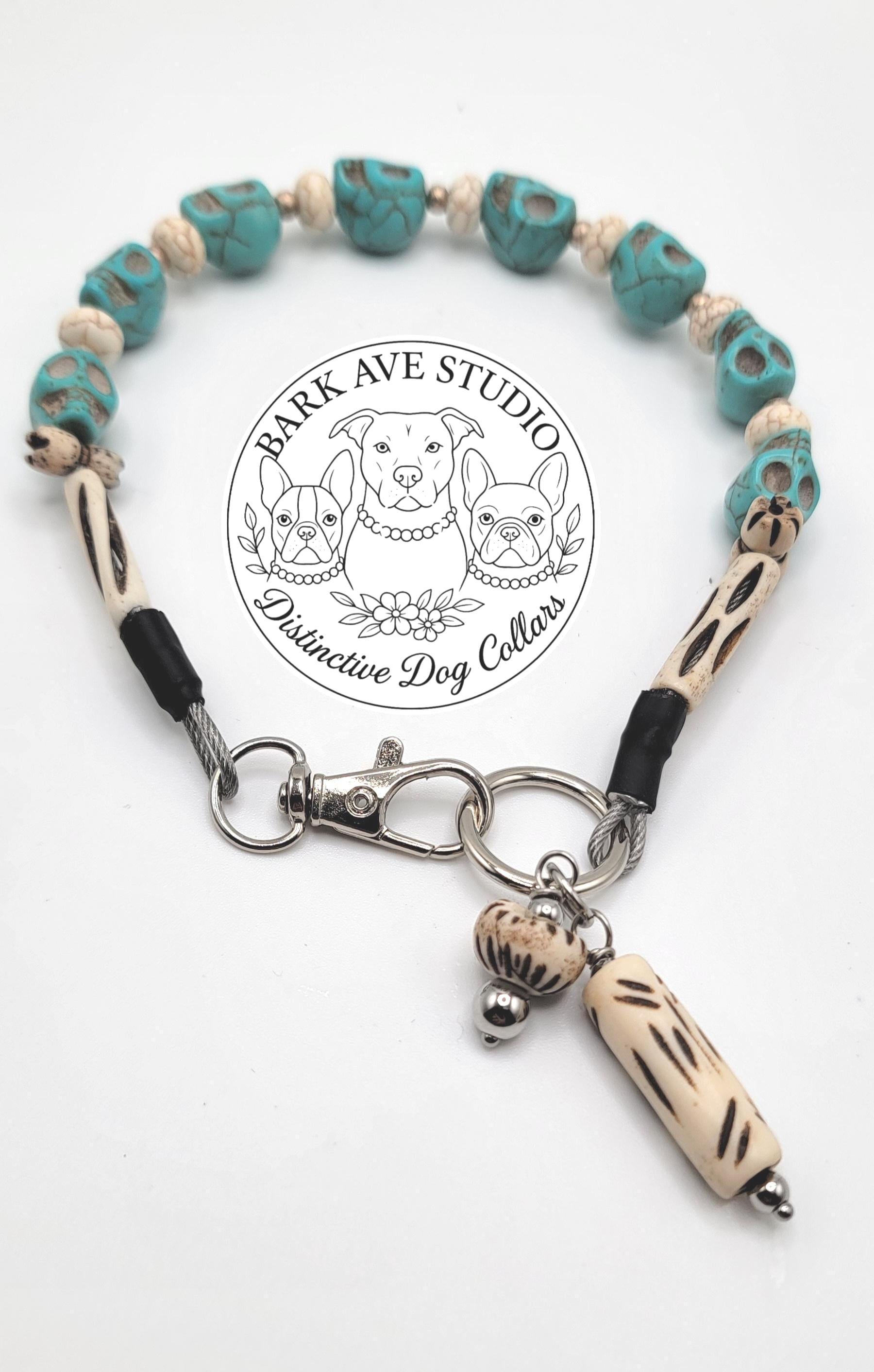 Add a bold, boho edge to your pup’s look with this handcrafted turquoise skull dog collar from Bark Ave Studio. Featuring vibrant Howlite skull beads, Howlite spacer beads, tribal-style cow bone accents and African silver metal beads, this collar is a showstopper for stylish dogs and their humans.