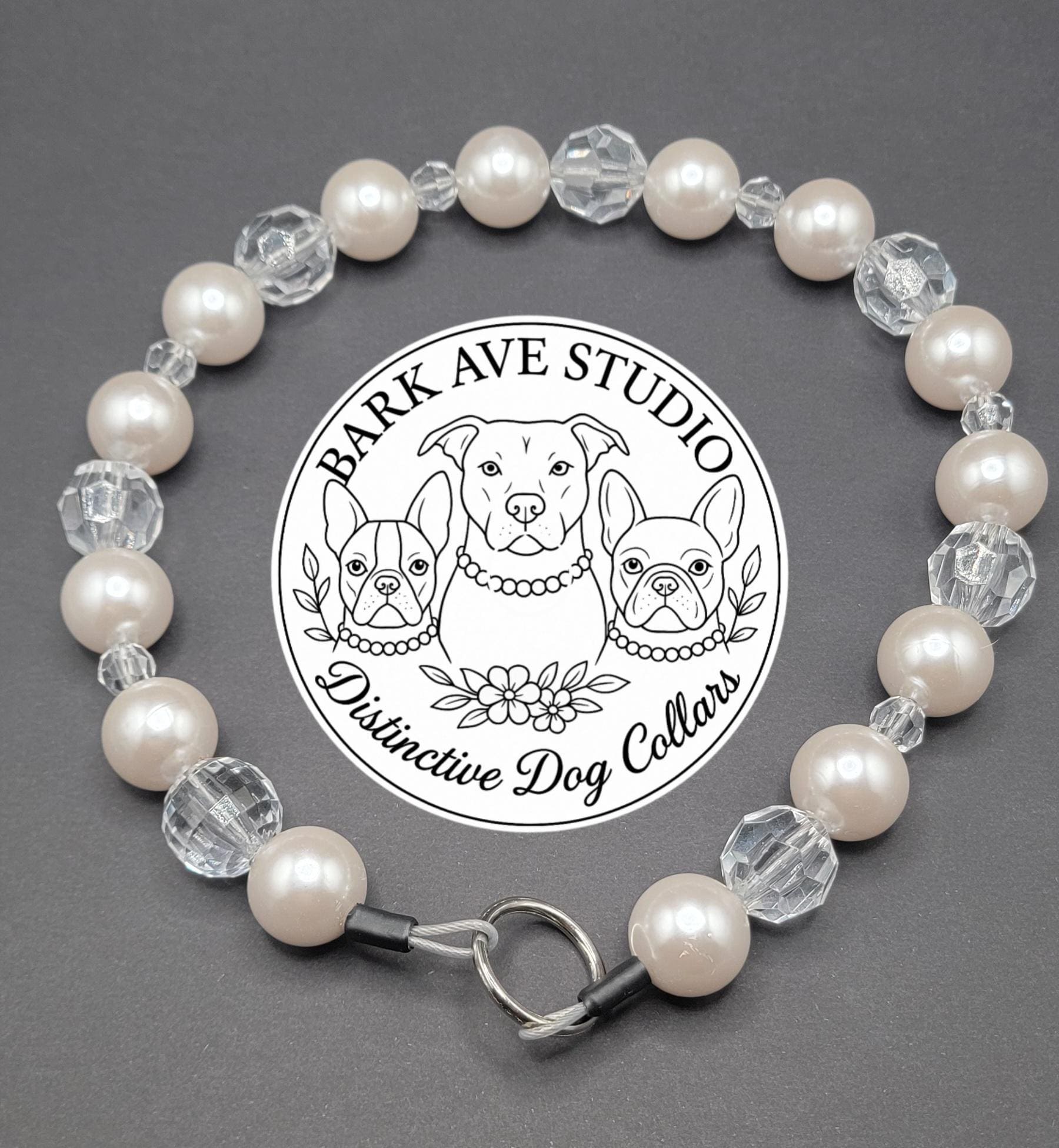 Add a touch of timeless elegance to your pup's style with our handcrafted Pearl & Crystal Dog Collar from Bark Ave Studio. This beautiful design features luminous 20mm faux white resin pearl beads and faceted 20mm & 10mm crystal-clear resin beads. Treat your pet to the luxury they deserve!
