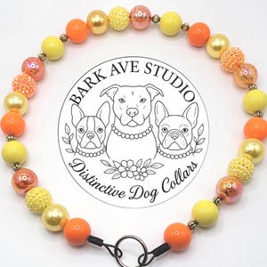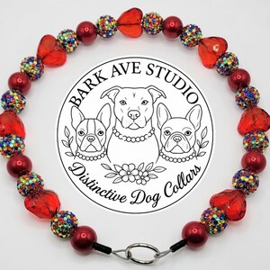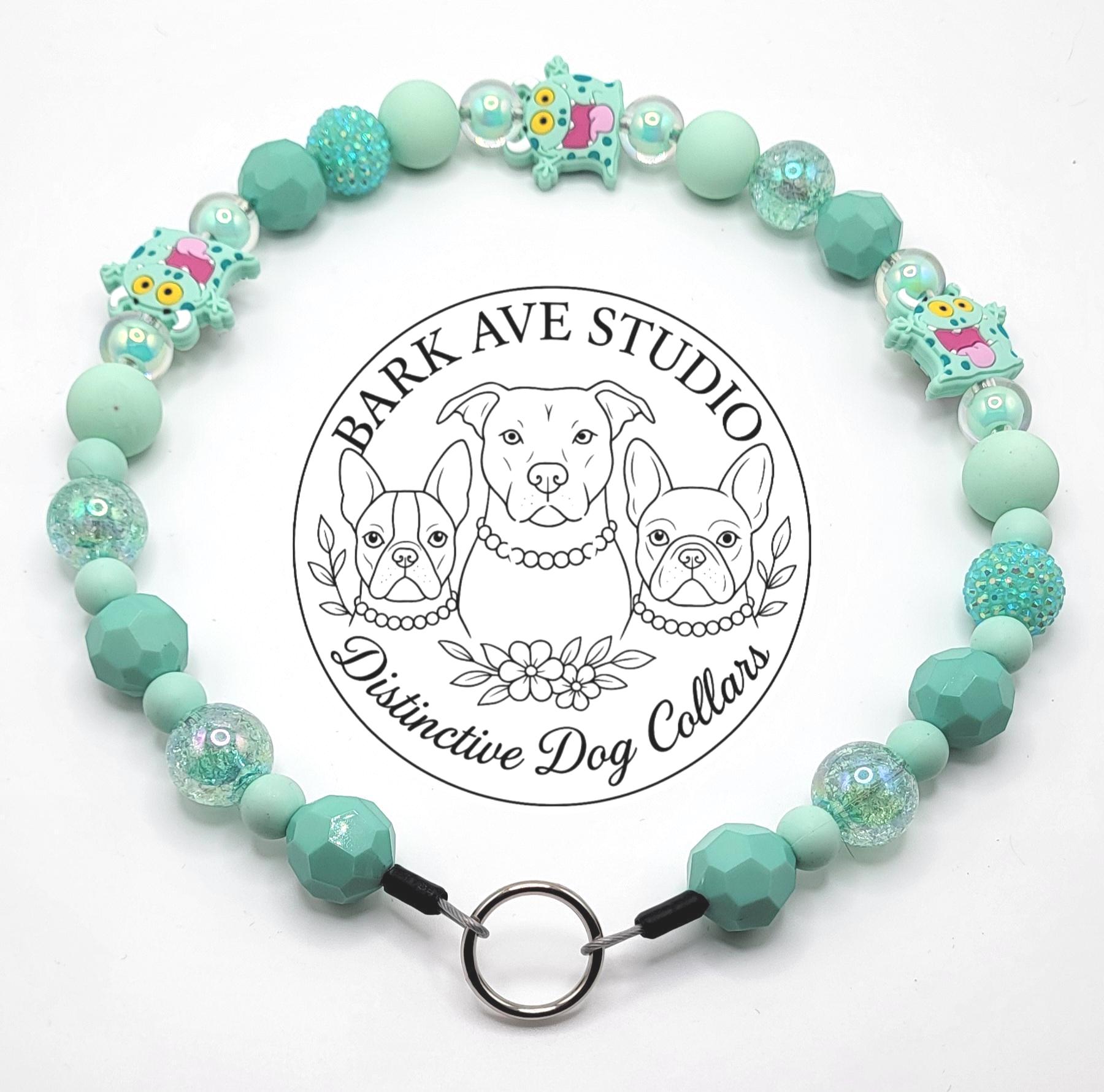 This charming beaded dog collar features a playful mix of 20mm aqua, mint, and glitter beads, accented with adorable little monster-shaped beads for a fun and whimsical touch. Handcrafted with care, this collar is perfect for your pup's everyday adventures or special outings.