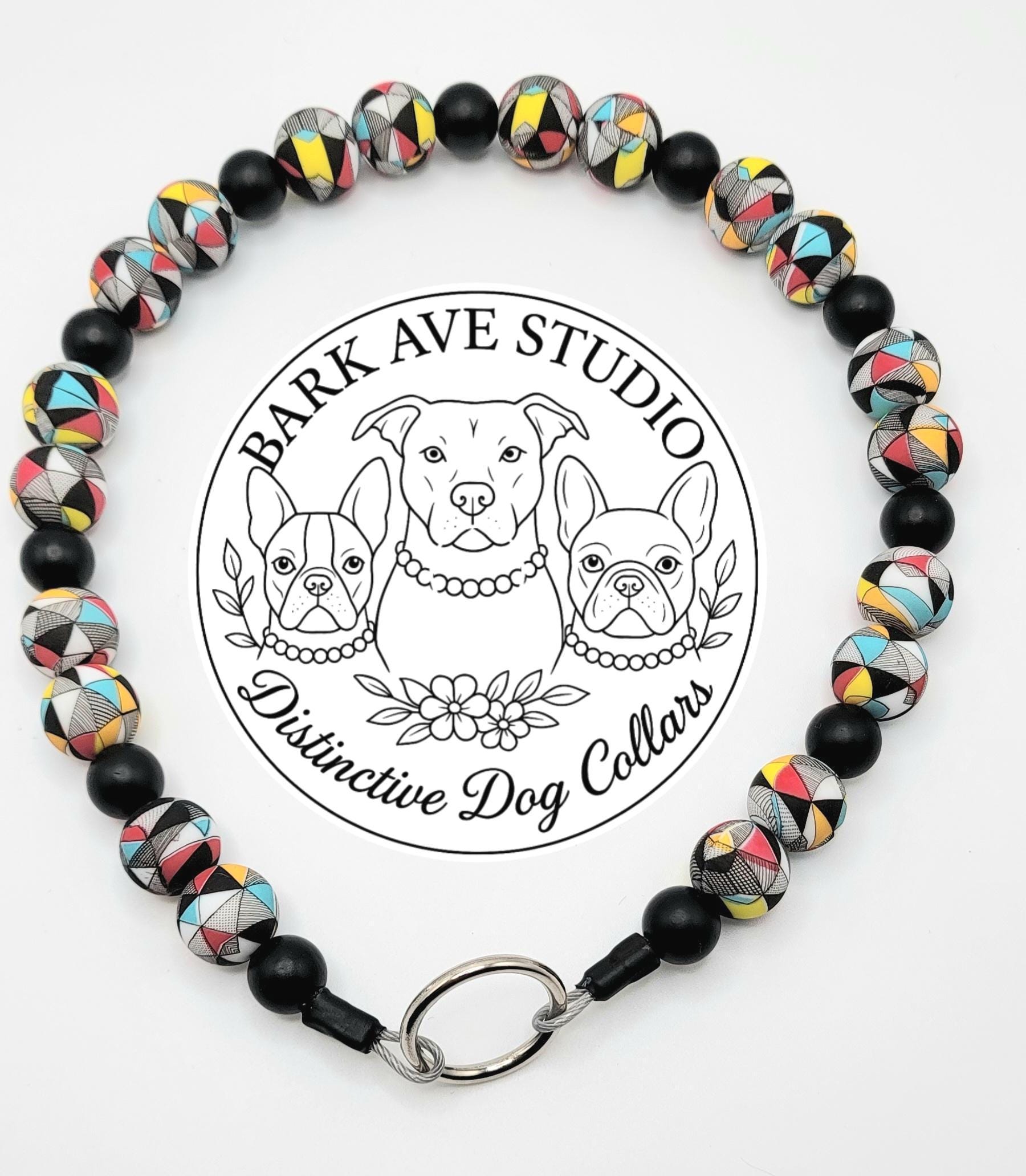 Introducing our Mosaic Pattern Dog Collar, a perfect blend of style and comfort for your furry friend! This unique collar features a stunning combination of 15mm silicone beads adorned with eye-catching colorful mosaic patterns and 10mm black acrylic beads, all boasting a chic matte finish.