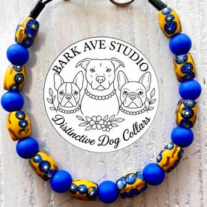 This adorable gray and white dog collar is the perfect blend of playful charm and handmade craftsmanship. Designed with vibrant 15mm gold-orange gingham beads, sparkling 20mm rhinestone beads, and sleek 15mm matte black rounds, it features a 28mm silicone lovable puppy at the center, complete with stainless steel heart accents for an extra sweet touch.