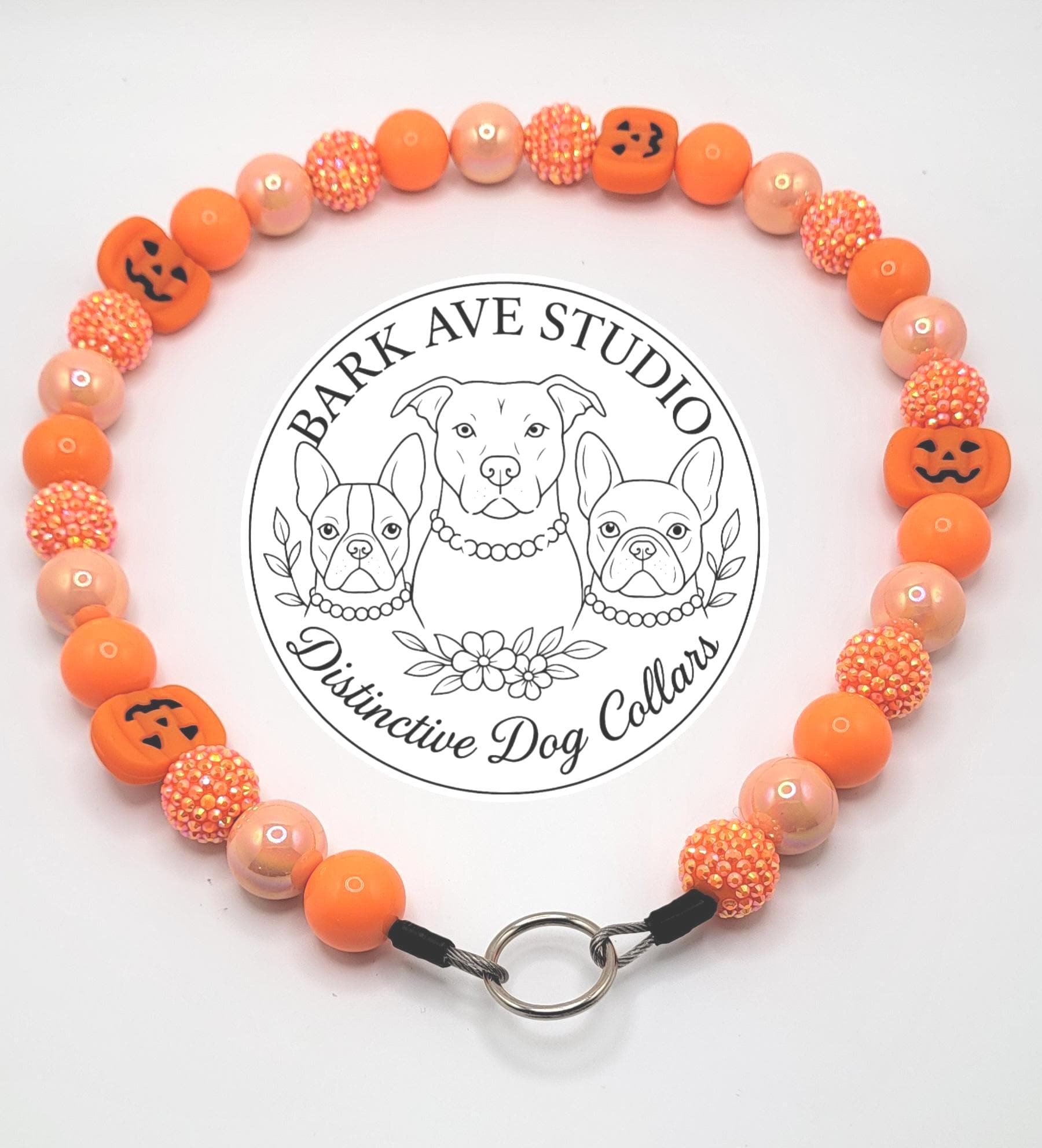 Get your pup ready for spooky season with this festive Halloween beaded dog collar! Featuring adorable jack-o'-lantern beads, shimmering orange and pearl accents, and sparkly rhinestone beads, this collar is perfect for adding a playful touch to your dog's fall wardrobe.