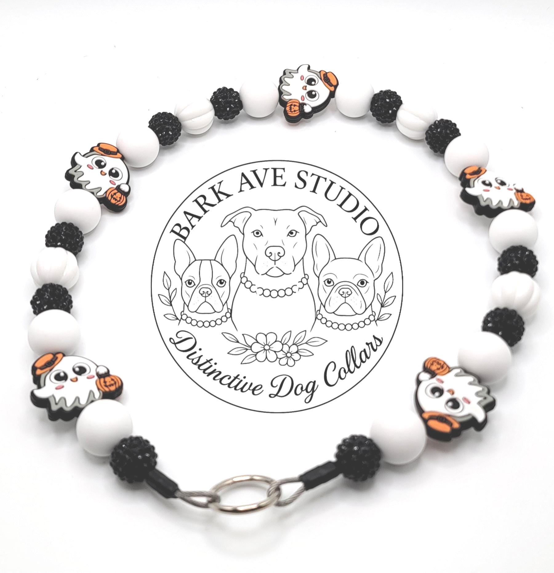 Add a spooky-cute twist to your pup's Halloween look with this ghost-themed beaded dog collar! Featuring charming ghost beads holding pumpkins, sparkly black accent beads, and smooth white rounds, this handmade collar is perfect for dogs who want to join in the festive fun.