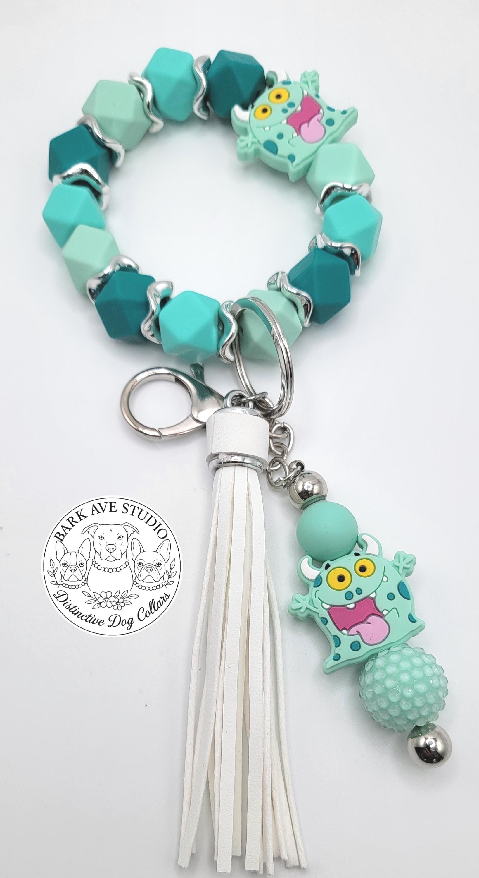 Teal Monster Beaded Wristlet Keychain: Fun Cartoon Keyring