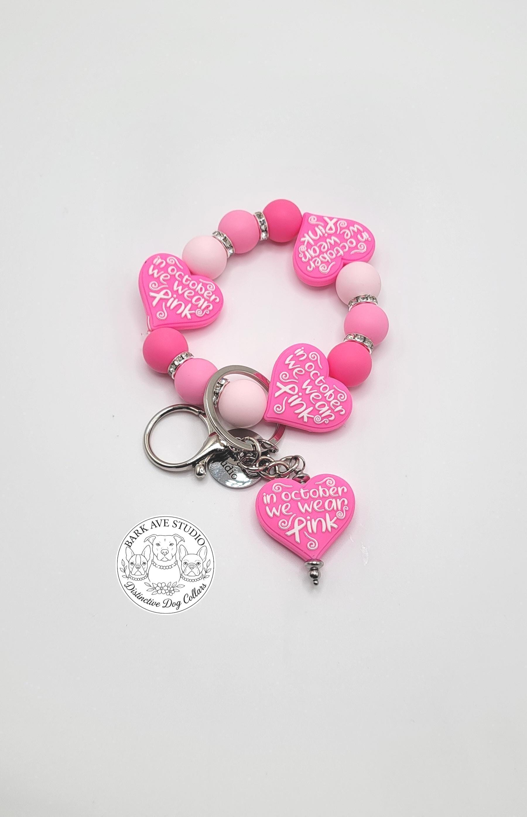 Breast Cancer Awareness Keychain: Pink Beaded Wristlet with Heart Charms