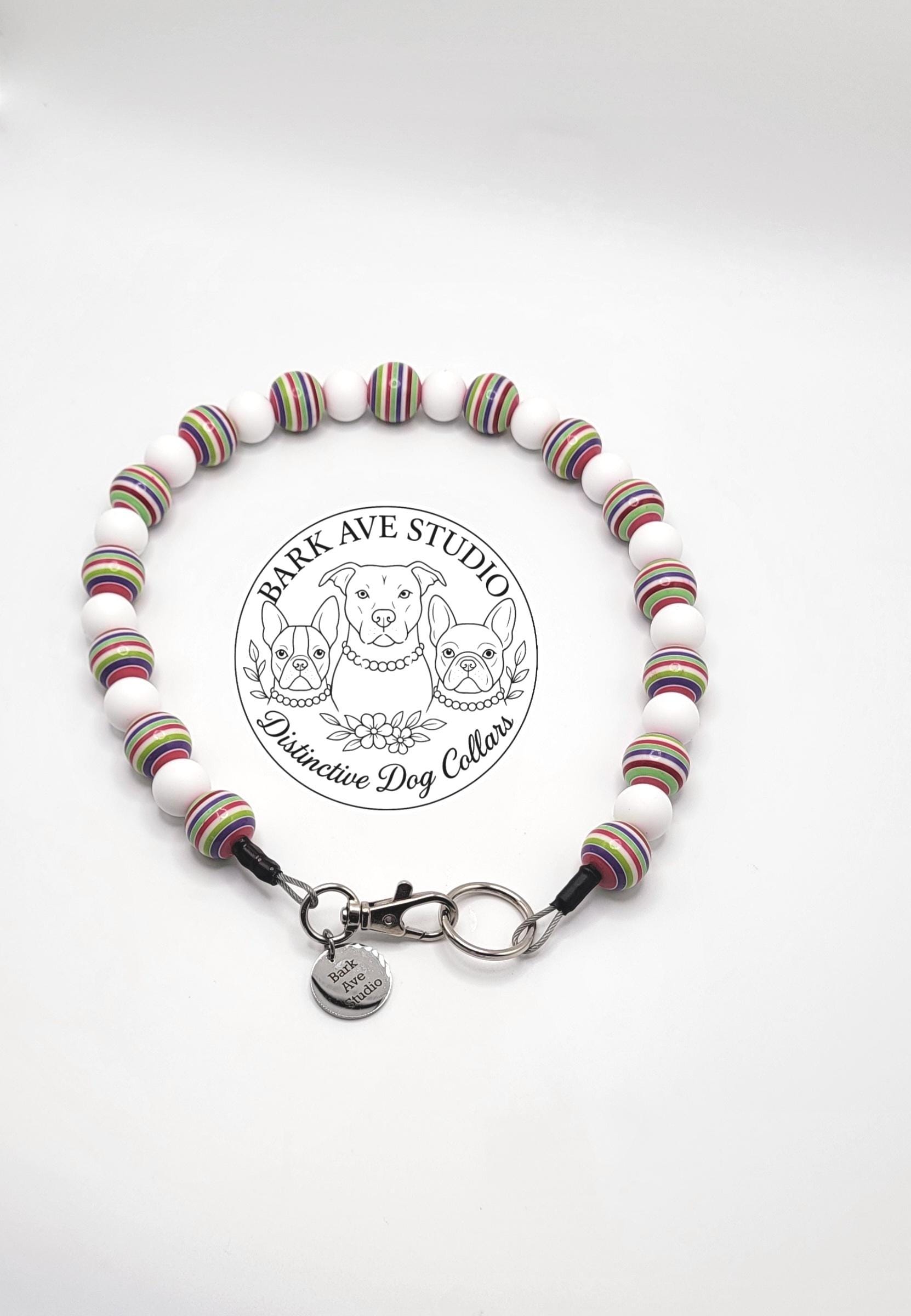 Brighten up your pup's style with this handmade beaded dog collar, featuring a playful mi of white beads and bold striped multicolor beads in shades of pink, purple, green, and red. Each collar is carefully crafted using strong stainless steel vinyl-coated wire for secure everyday wear.