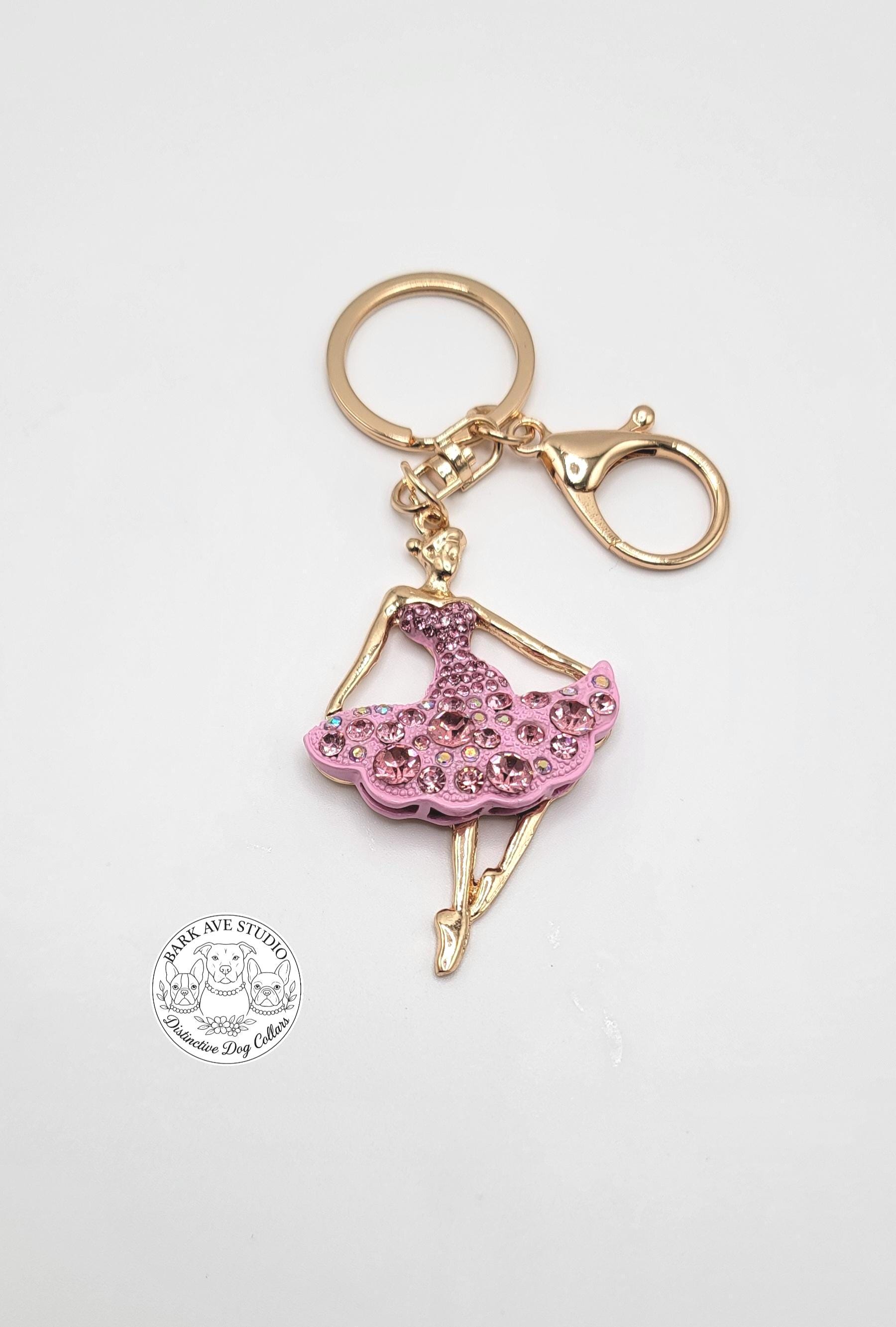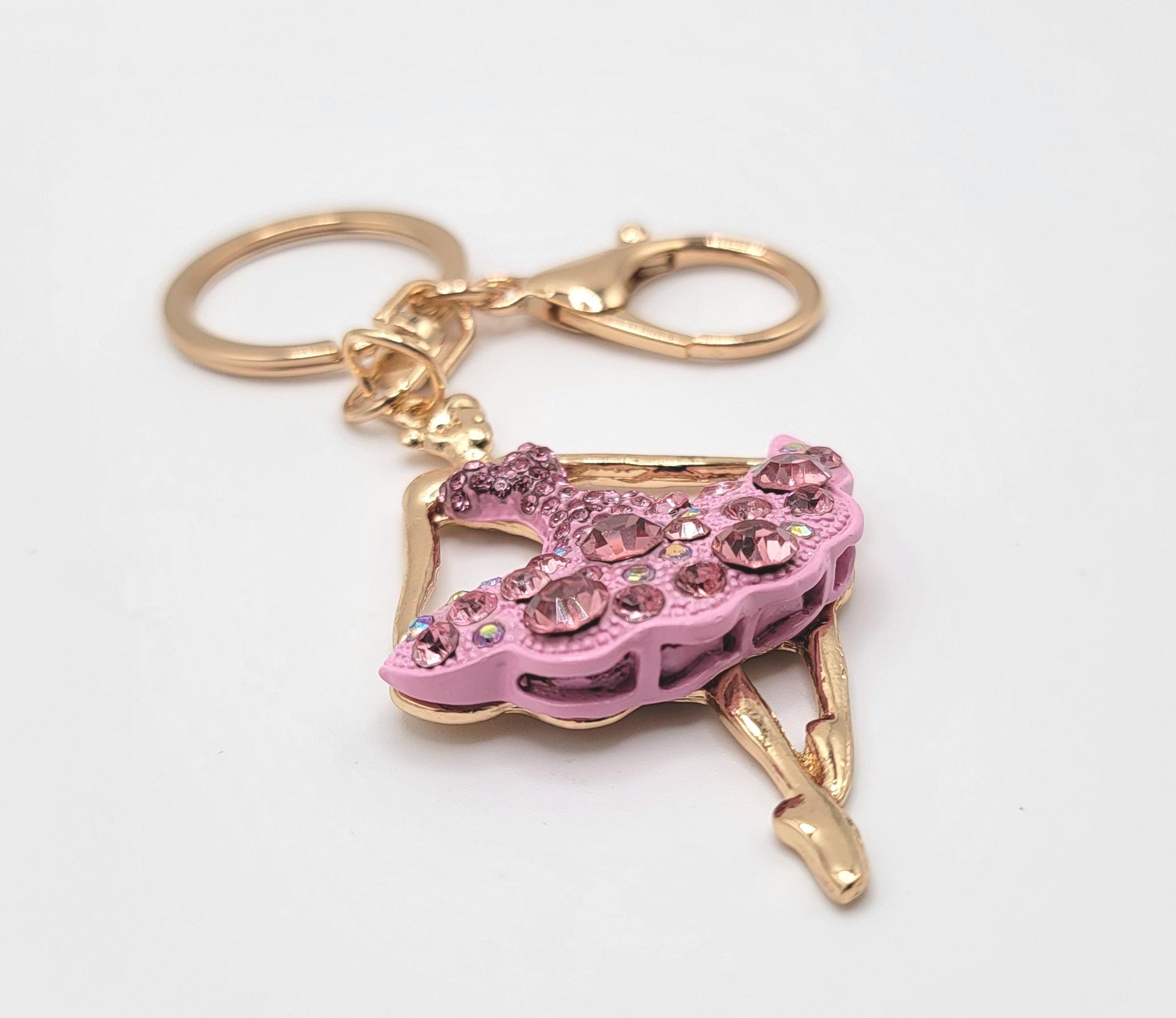 Celebrate the beauty of dance with this elegant ballerina keychain, featuring a graceful dancer in a pink rhinestone-studded dress. The sparkling crystals and gold-tone finish make this charm a dazzling accessory for keys, purses, or dance bags. Perfect as a thoughtful gift for dancers, ballerinas, dance moms, or teachers, this keychain captures the artistry and grace of ballet. With its sturdy lobster clasp and keyring, it's both practical and stylish, making it a lovely keepsake or everyday accessory.