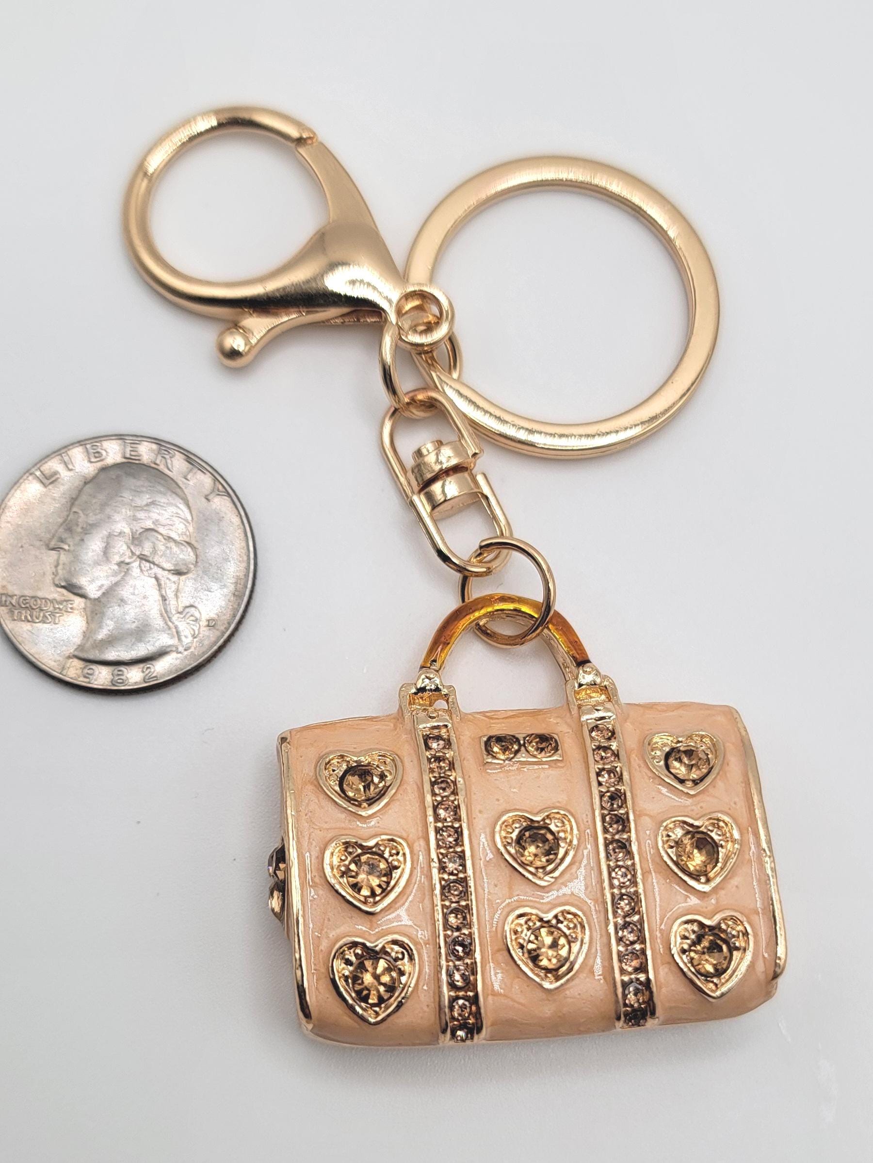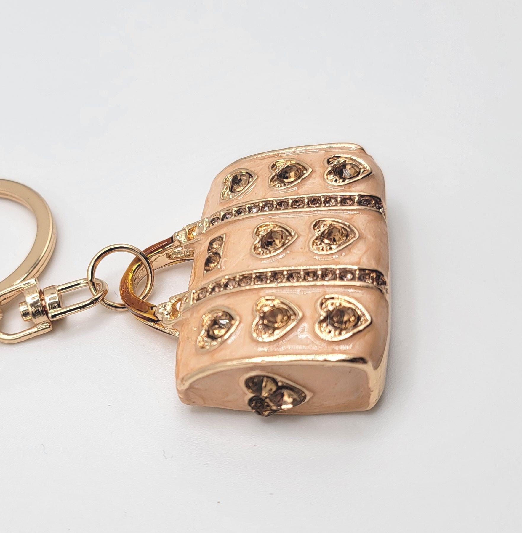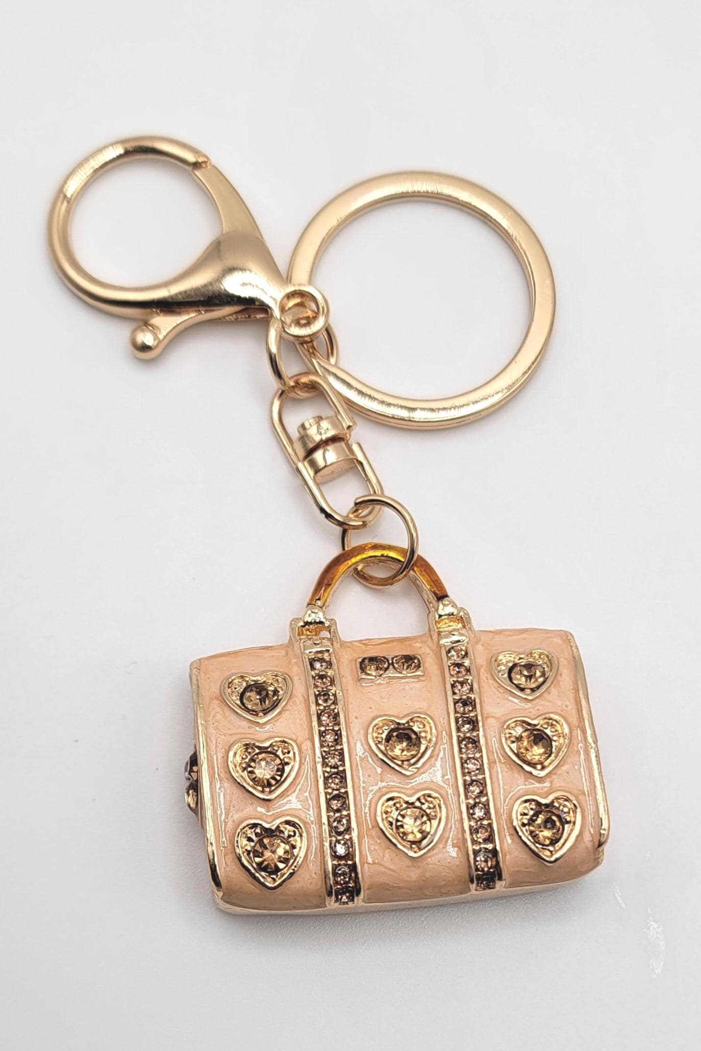 Carry a little sparkle everywhere you go with this gold handbag keychain bag charm. Designed to look like a chic mini purse, it features a glossy beige enamel finish with sparkling rhinestone heart accents on the front and both sides. Perfect for attaching to your keys, tote, or backpack, this keychain doubles as a fashion accessory and a thoughtful gift. Whether you love handbags, sparkle, or simply want to add a stylish accent to your everyday essentials, this charm is sure to delight.