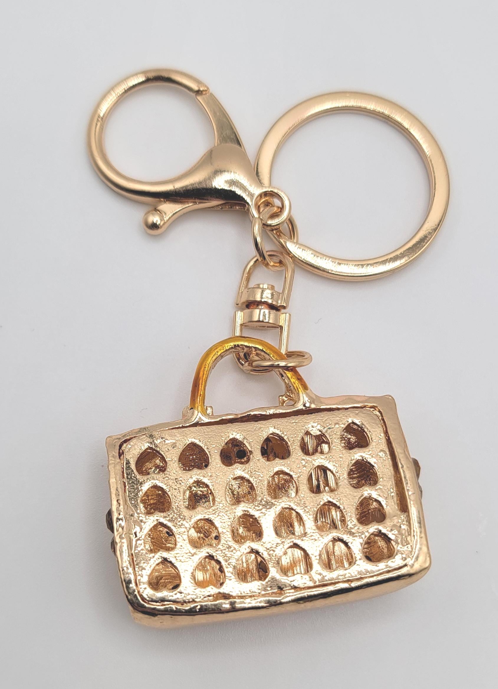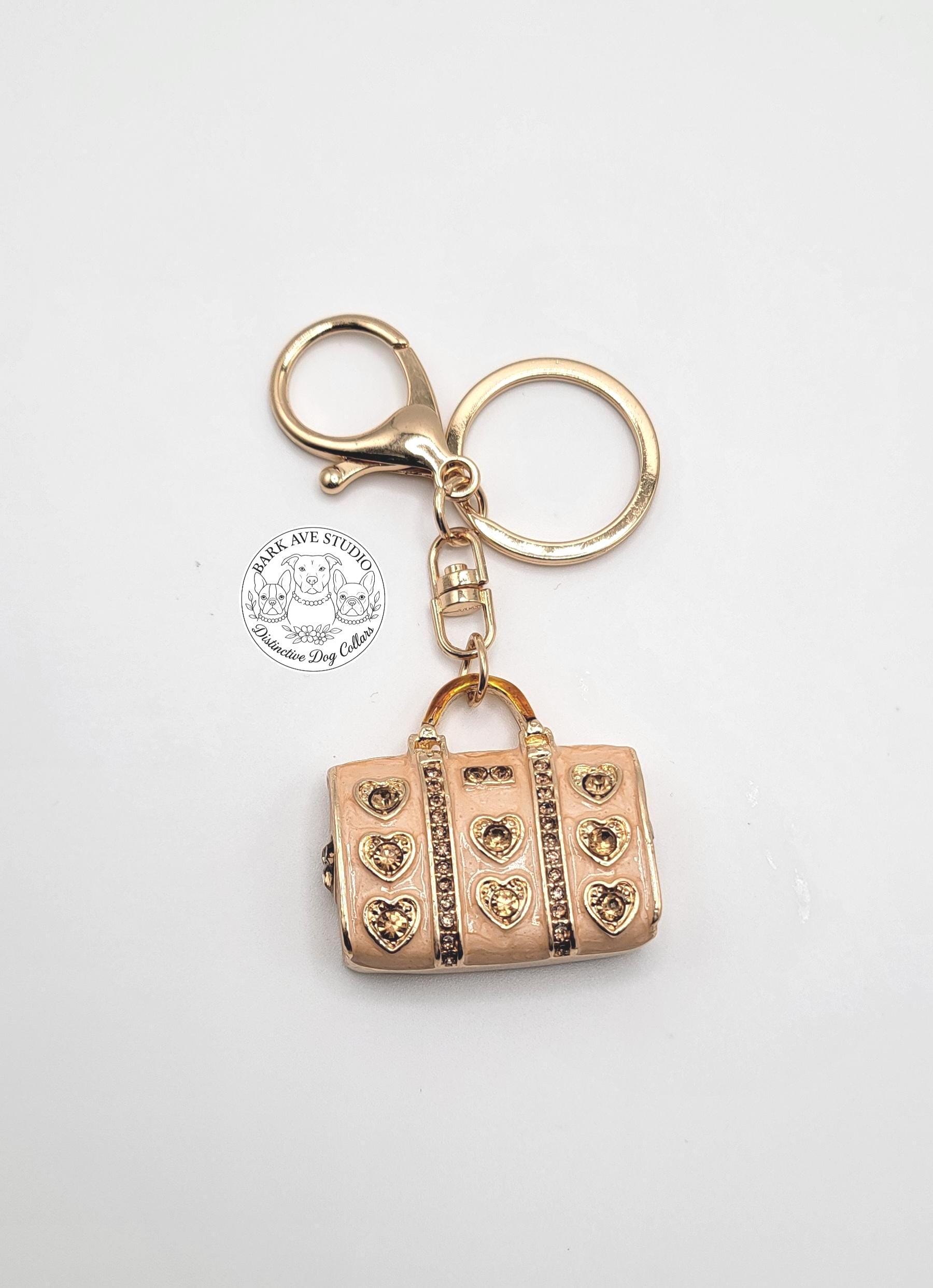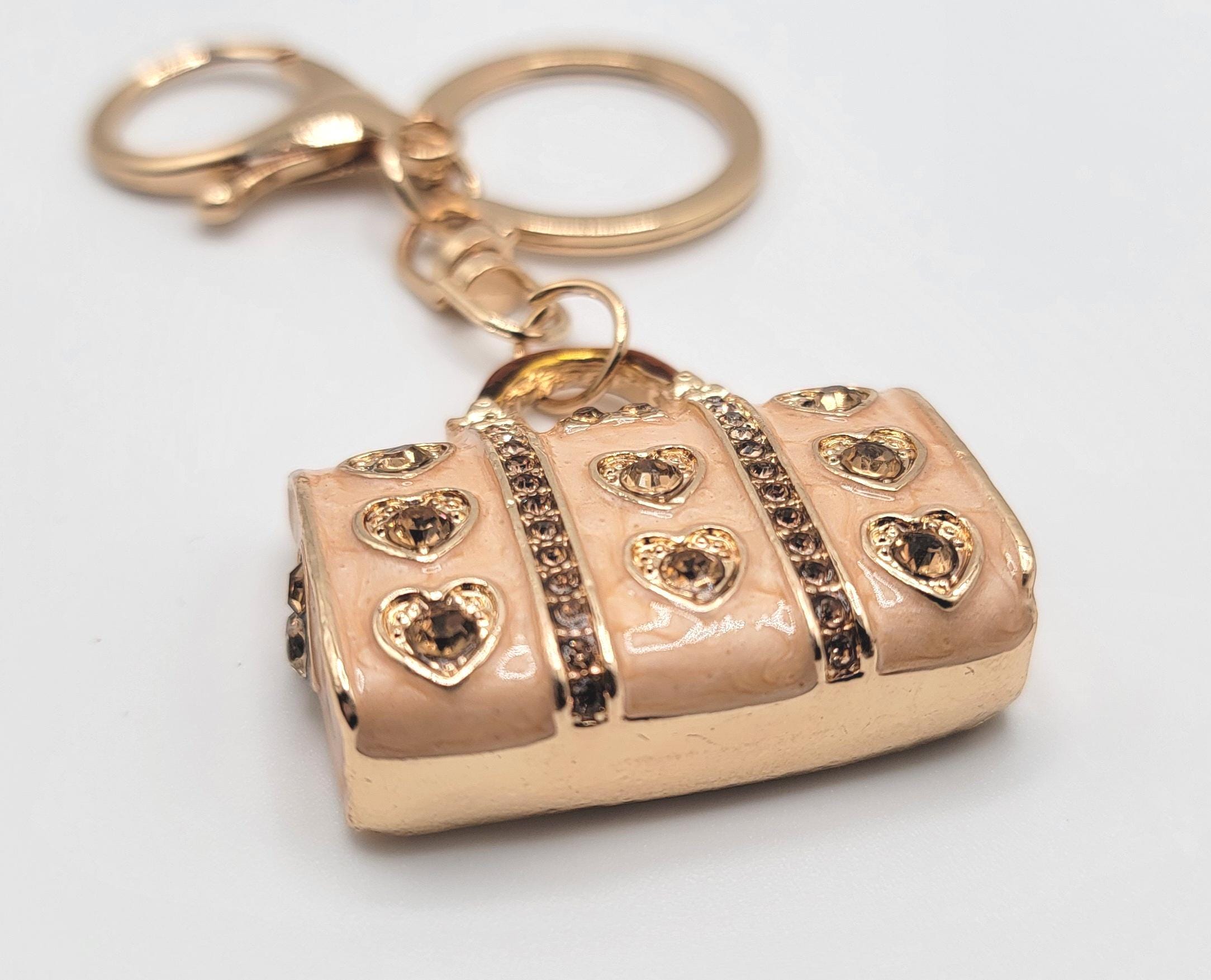Carry a little sparkle everywhere you go with this gold handbag keychain bag charm. Designed to look like a chic mini purse, it features a glossy beige enamel finish with sparkling rhinestone heart accents on the front and both sides. Perfect for attaching to your keys, tote, or backpack, this keychain doubles as a fashion accessory and a thoughtful gift. Whether you love handbags, sparkle, or simply want to add a stylish accent to your everyday essentials, this charm is sure to delight.