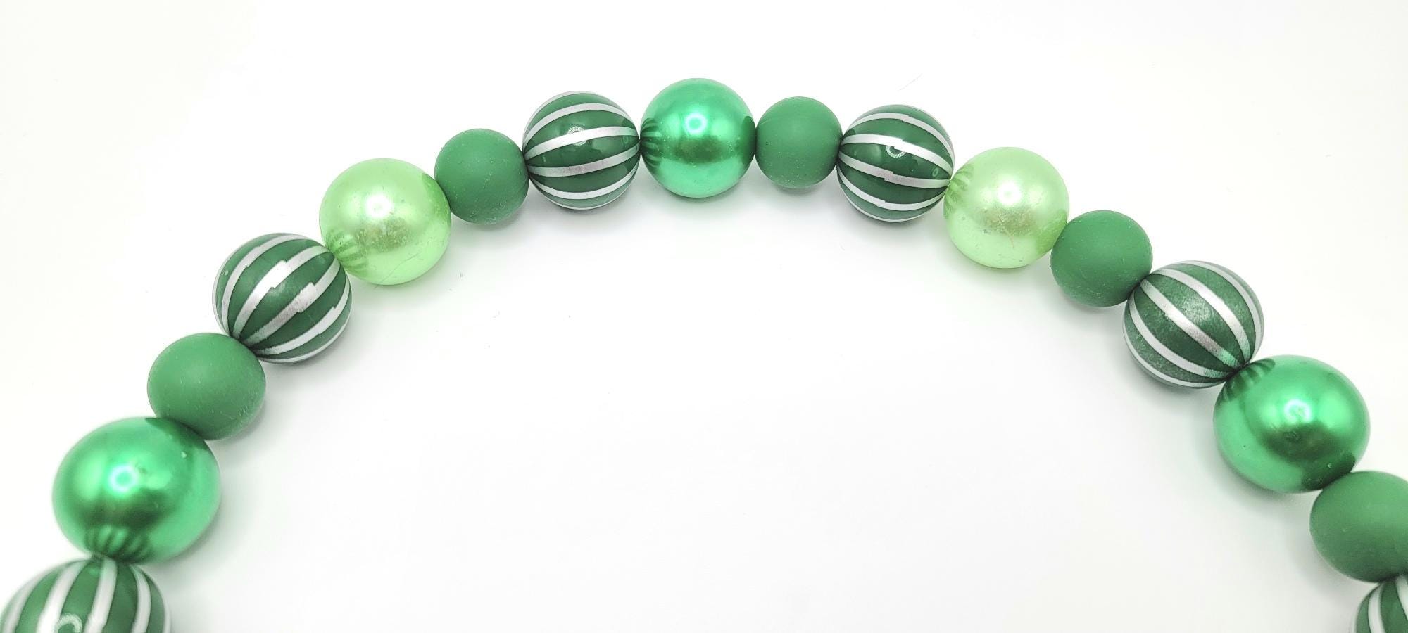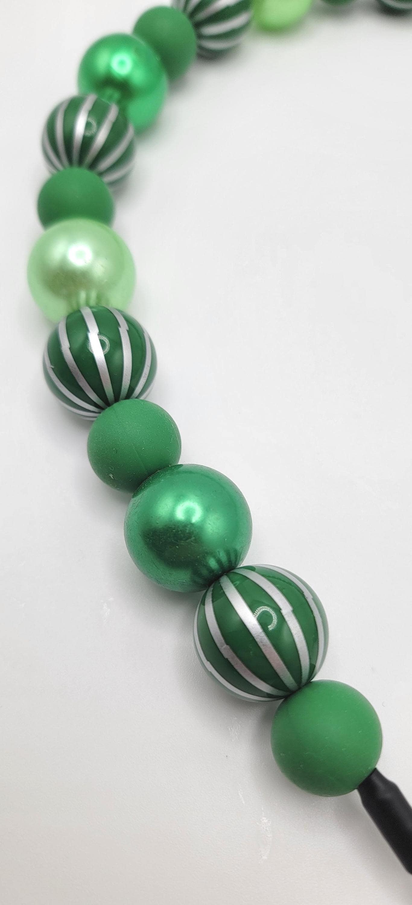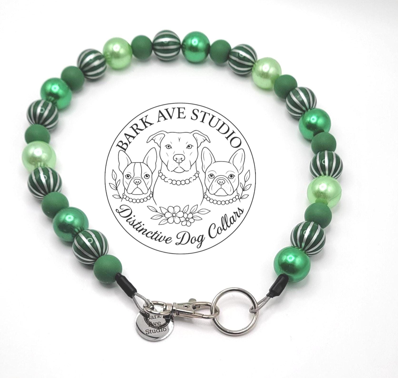 Bring the sparkle of the season to your pup's wardrobe with this stunning green Christmas Dog Collar from Bark Ave Studio. Featuring a mix of matte, metallic, and striped, green beads, this collar captures the look of shimmering ornaments and winter cheer. Whether your dog is posing by the tree or joining the family festivities, this collar adds just the right touch of Christmas sparkle and personality.