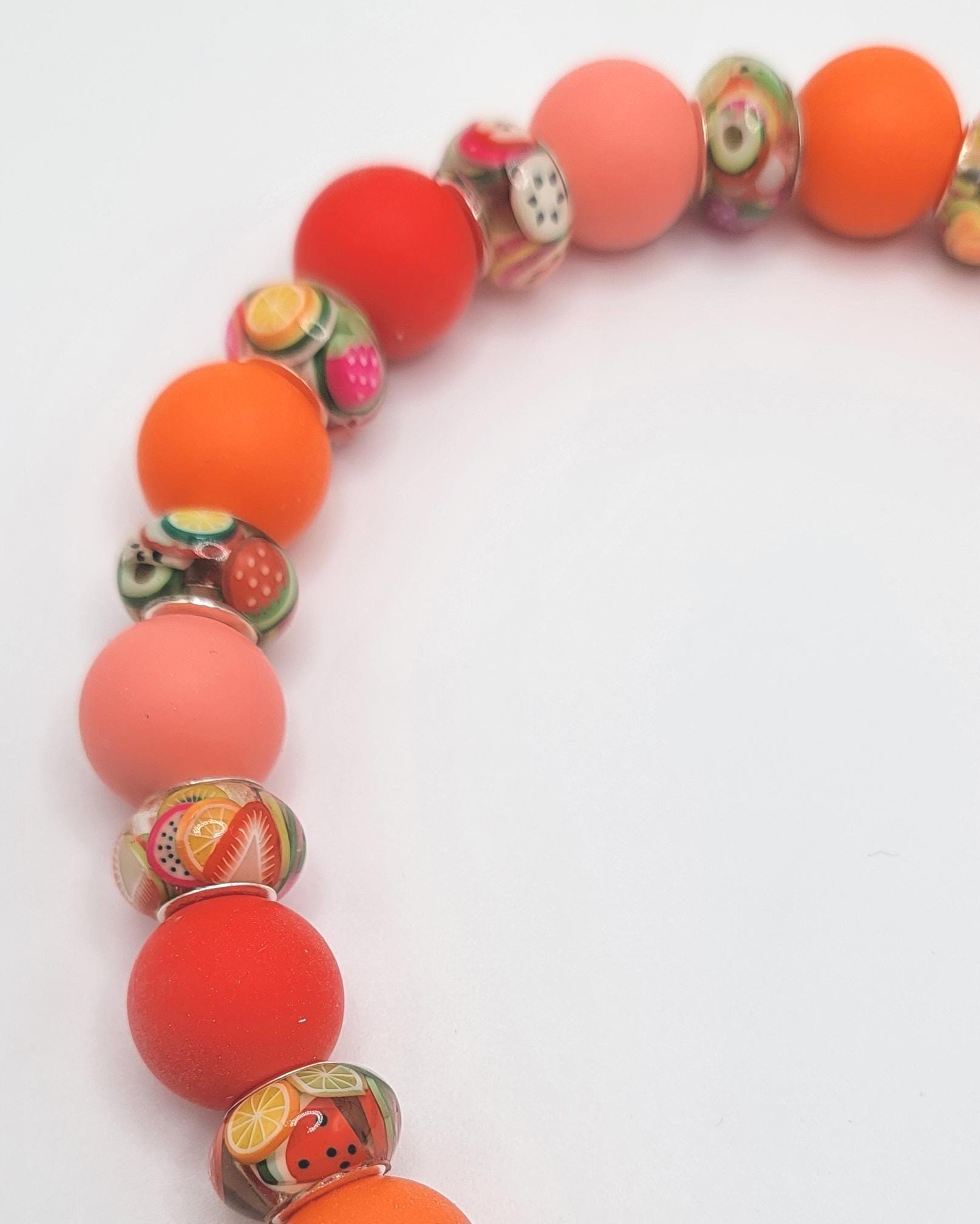 Bright, bold, and bursting with summer vibes! This Citrus Summer Beaded Dog Collar from Bark Ave Studio is the perfect pop of color for your pup's warm-weather adventures. Handcrafted with vibrant orange, coral, pink matte beads, and detailed fruit accent beads featuring lemons, strawberries, and citrus slices, this collar captures the fun and freshness of summertime. Perfect for beach days, outdoor walks, or just adding a cheerful splash of color, this handmade collar brings personality and playfulness to every outing.