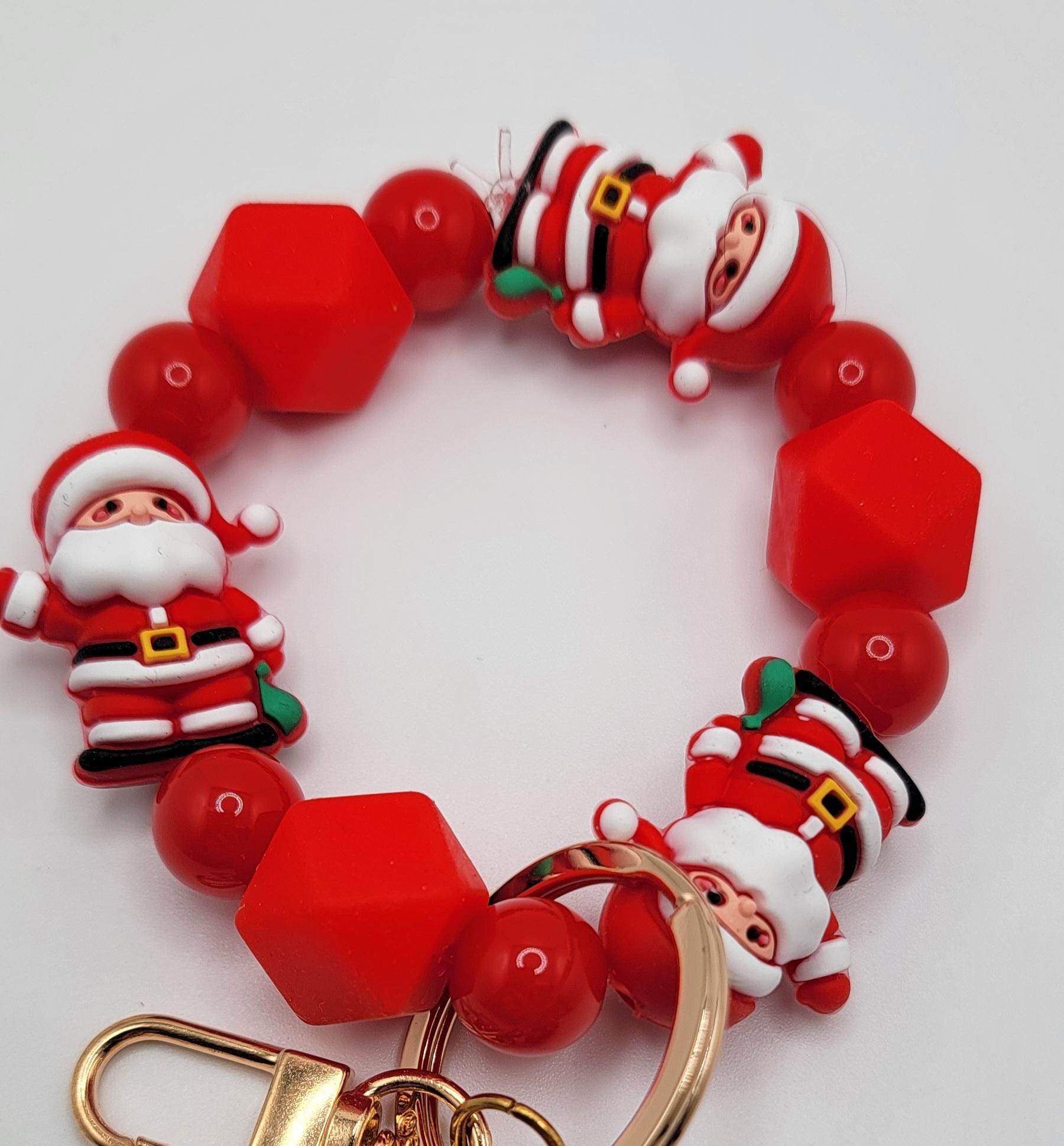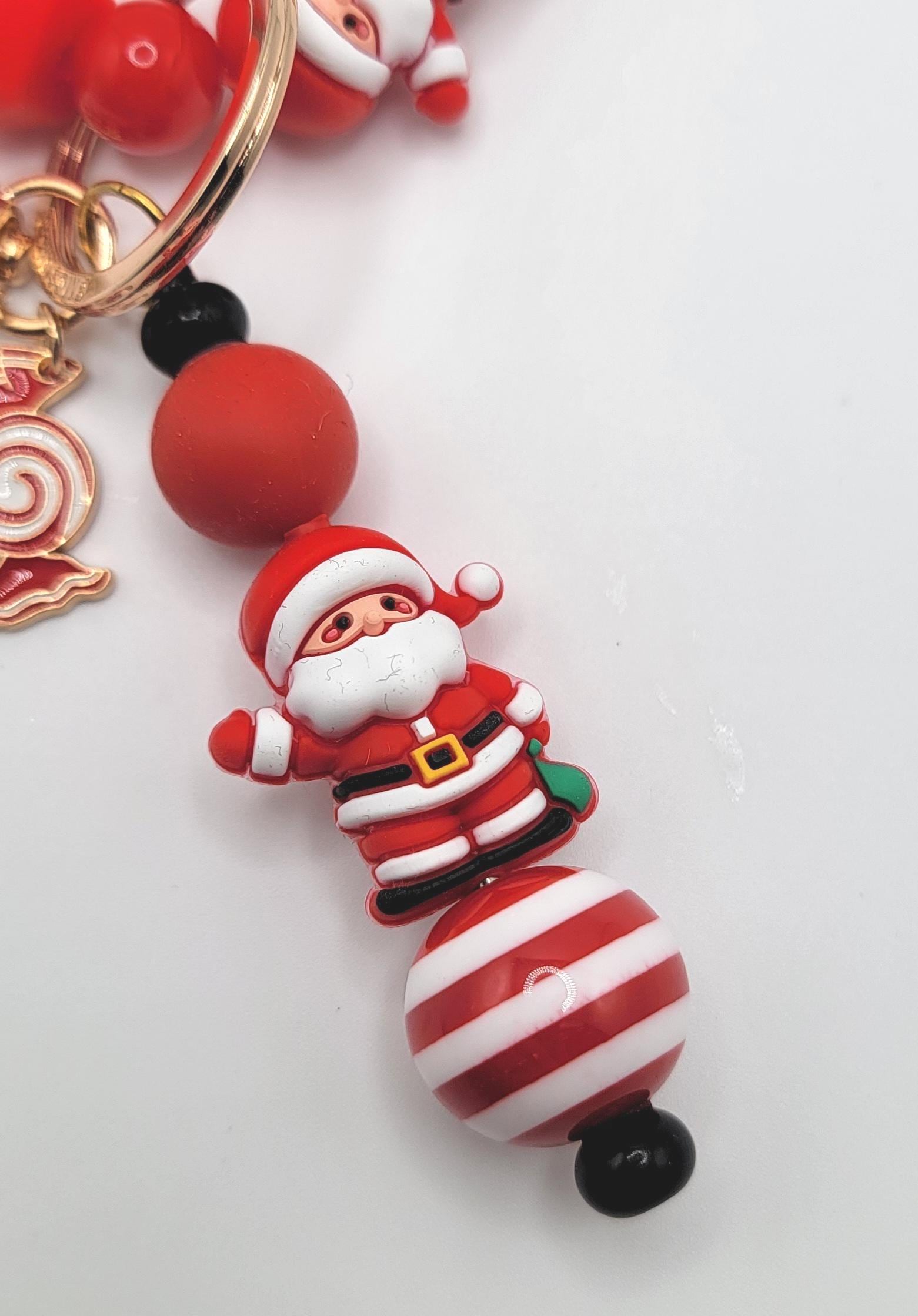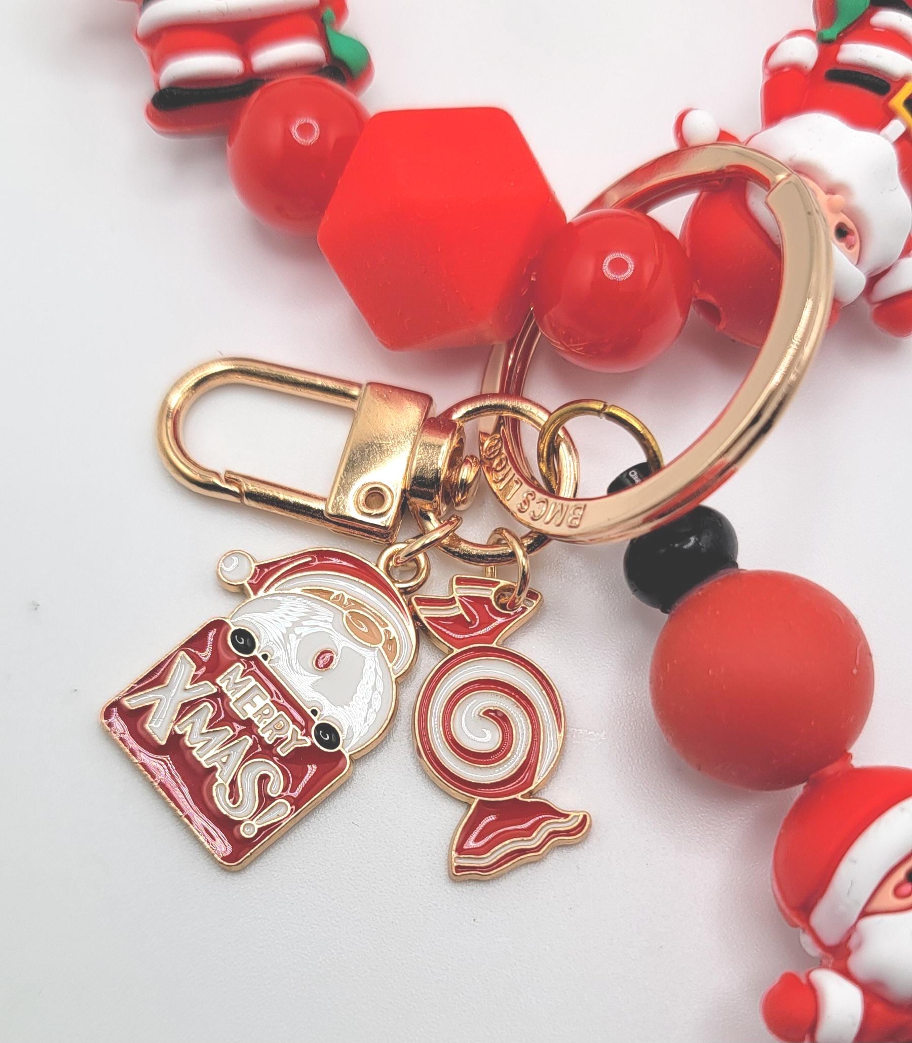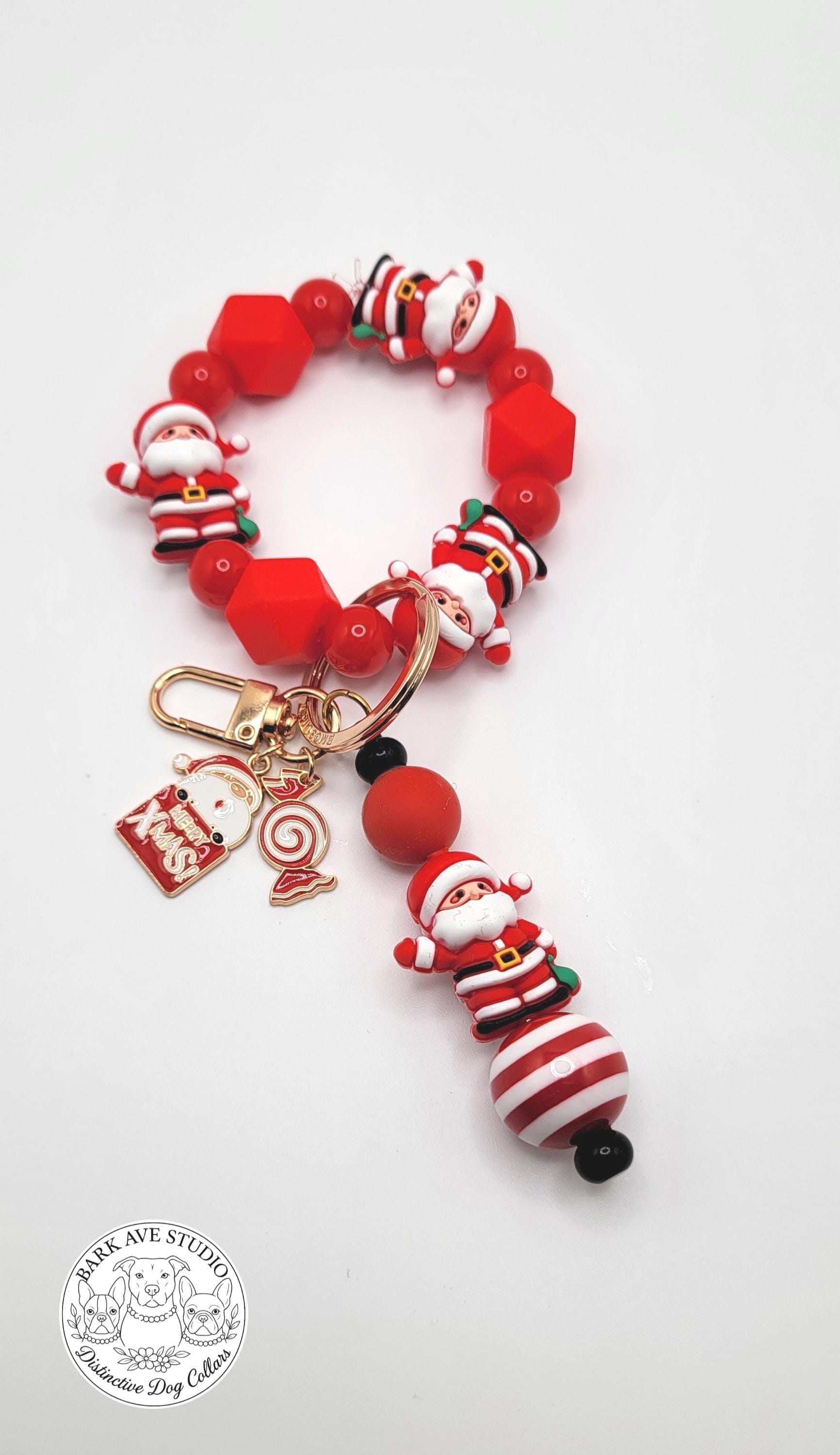 Santa Claus Christmas Beaded Keychain Wristlet - Red Santa Beads with Merry Xmas Charm - Holiday Keychain Bracelet - Cute Christmas Gift