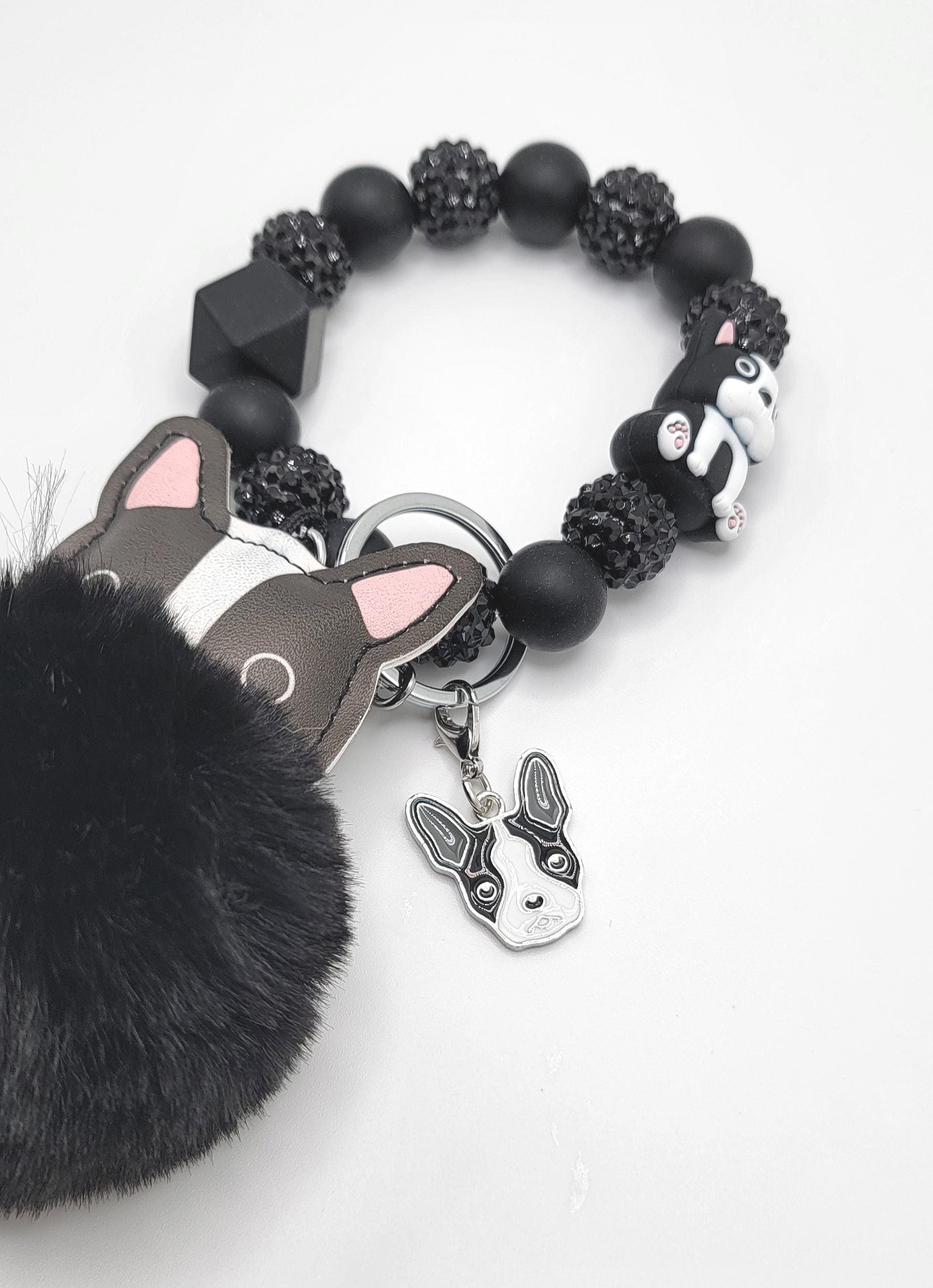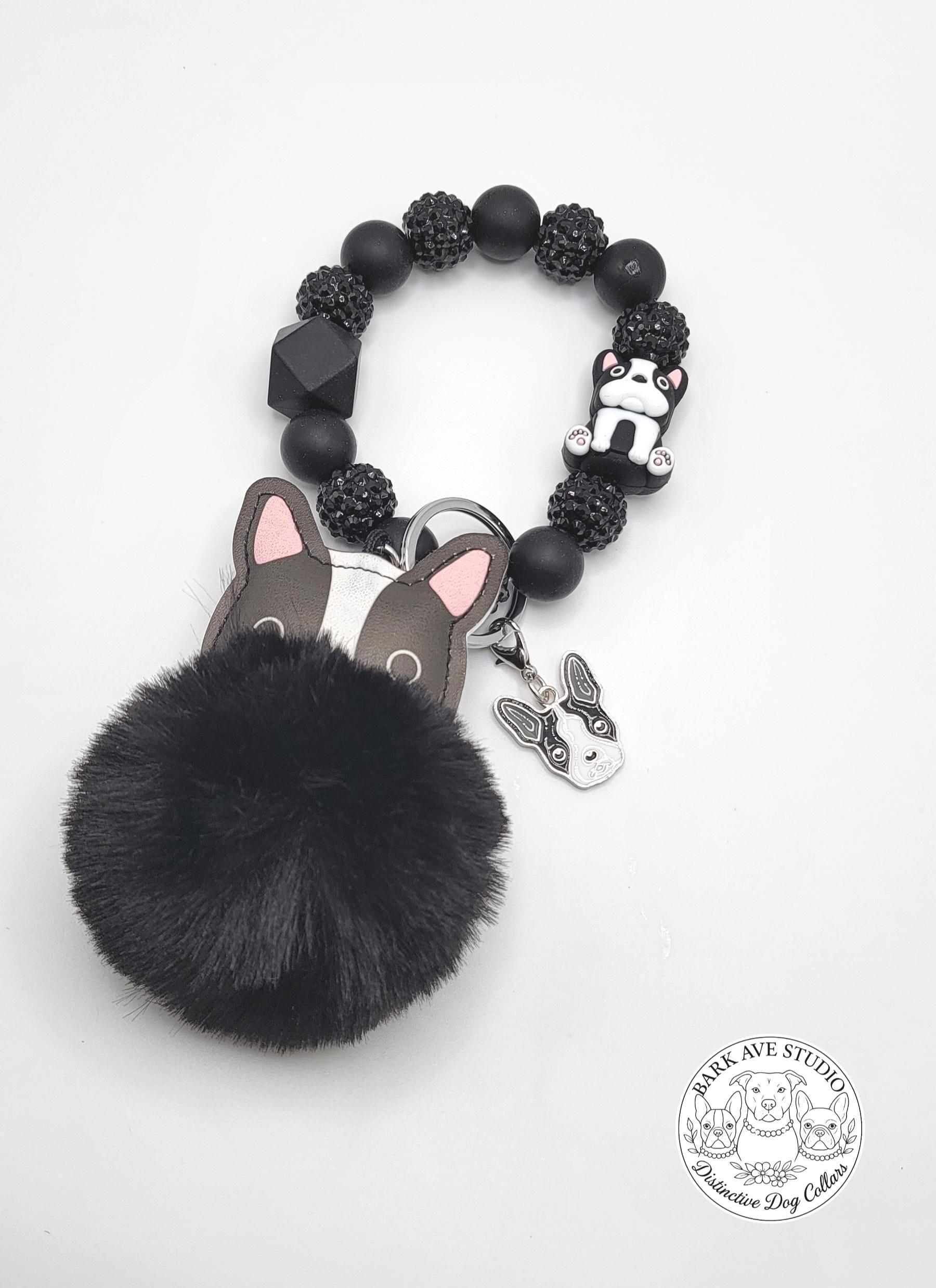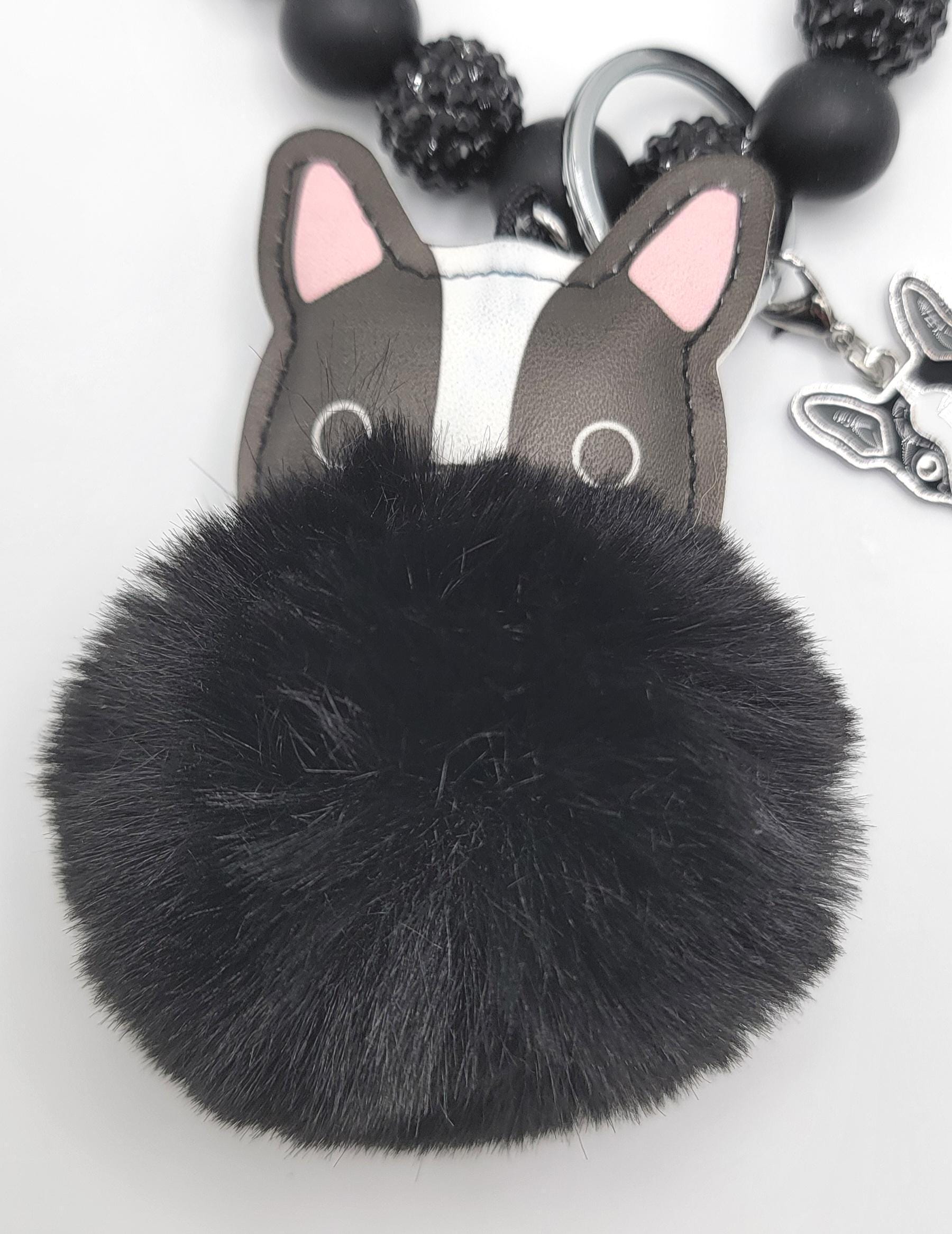 Never dig through your bag for your keys again! This adorable French Bulldog wristlet keychain is the perfect accessory for any dog lover - especially Frenchie fans! Handcrafted with a mix of matte black and sparkling rhinestone beads, it's both stylish and functional. It features a soft faux fur pom pom, a cute French Bulldog face charm, and a mini bone accent - a charming combination of sparkle and personality. Perfect as a thoughtful gift for dog moms, pet sitters, or anyone who loves French Bulldogs. Use it as a keychain, wristlet, or bag charm - it's sure to turn heads wherever you go!