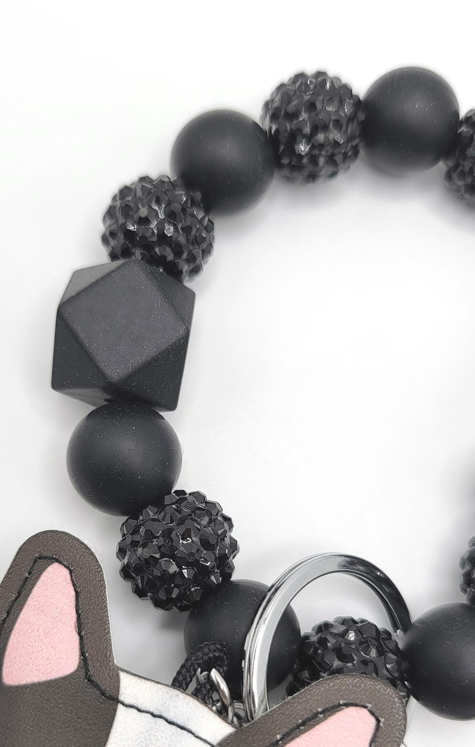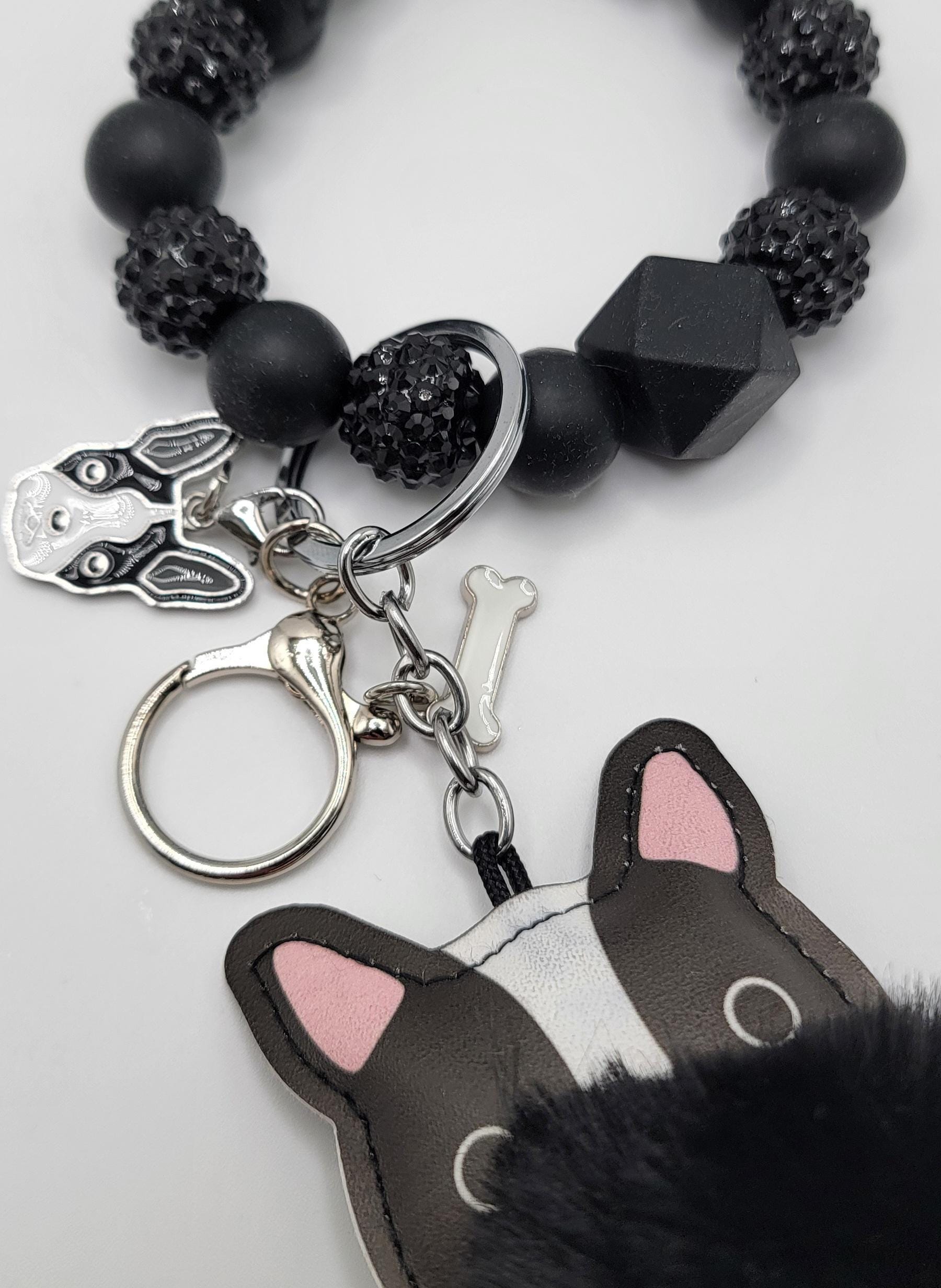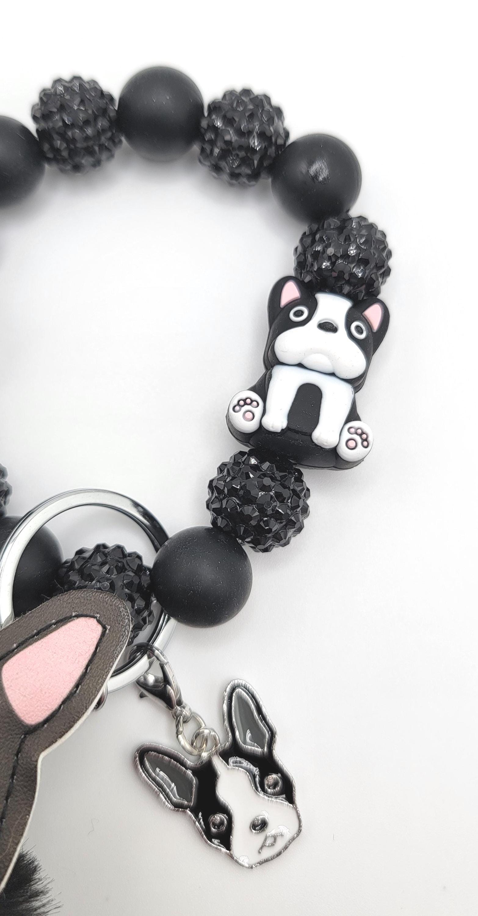 Never dig through your bag for your keys again! This adorable French Bulldog wristlet keychain is the perfect accessory for any dog lover - especially Frenchie fans! Handcrafted with a mix of matte black and sparkling rhinestone beads, it's both stylish and functional. It features a soft faux fur pom pom, a cute French Bulldog face charm, and a mini bone accent - a charming combination of sparkle and personality. Perfect as a thoughtful gift for dog moms, pet sitters, or anyone who loves French Bulldogs. Use it as a keychain, wristlet, or bag charm - it's sure to turn heads wherever you go!