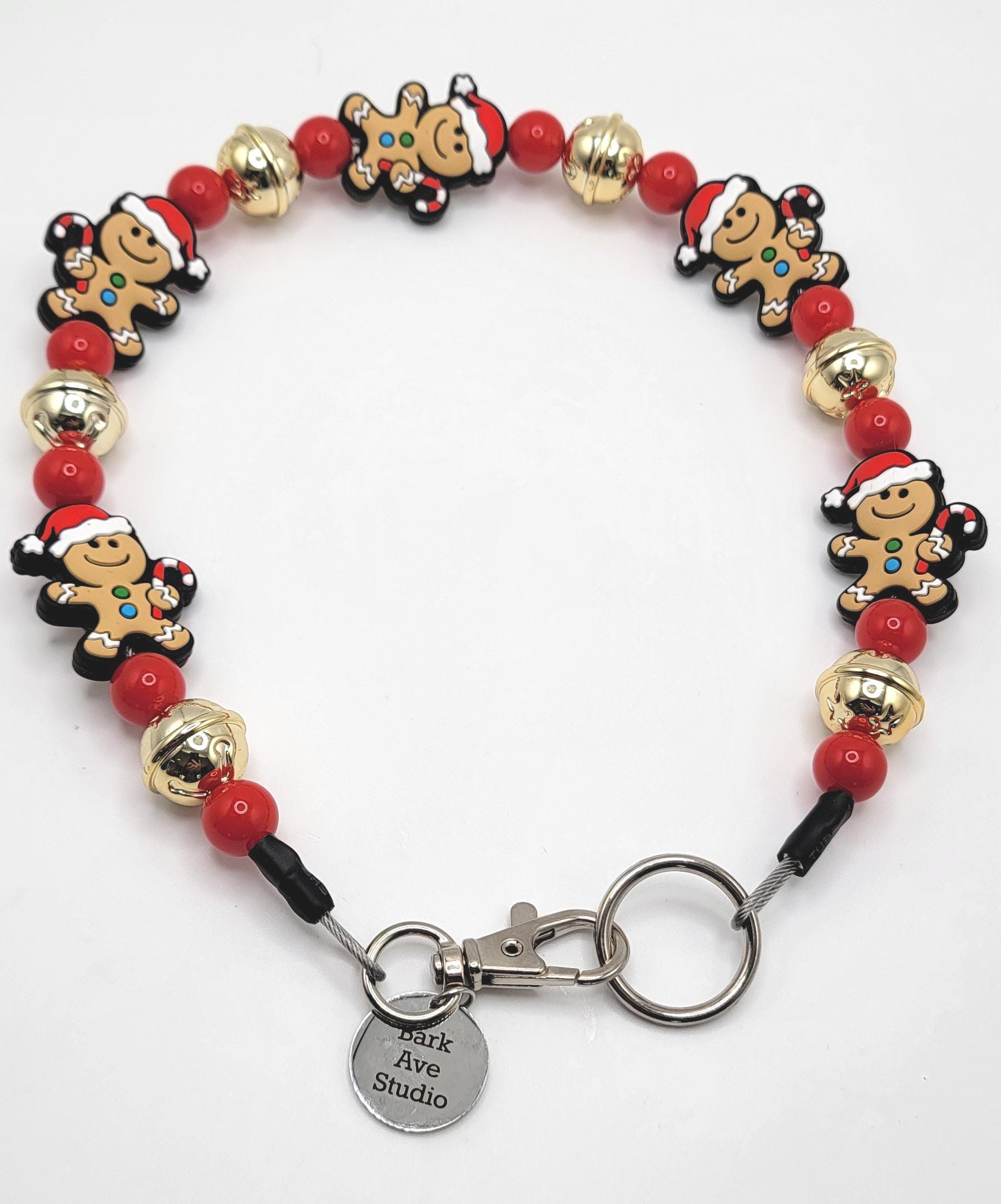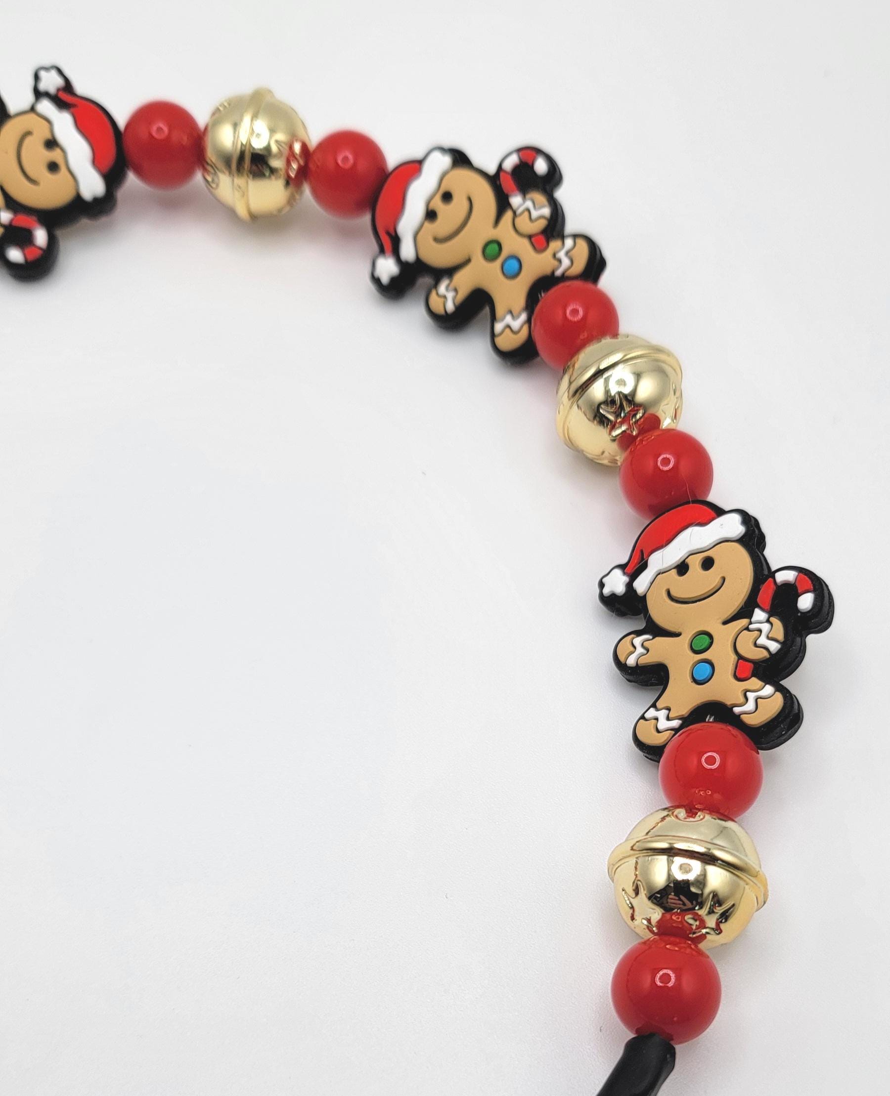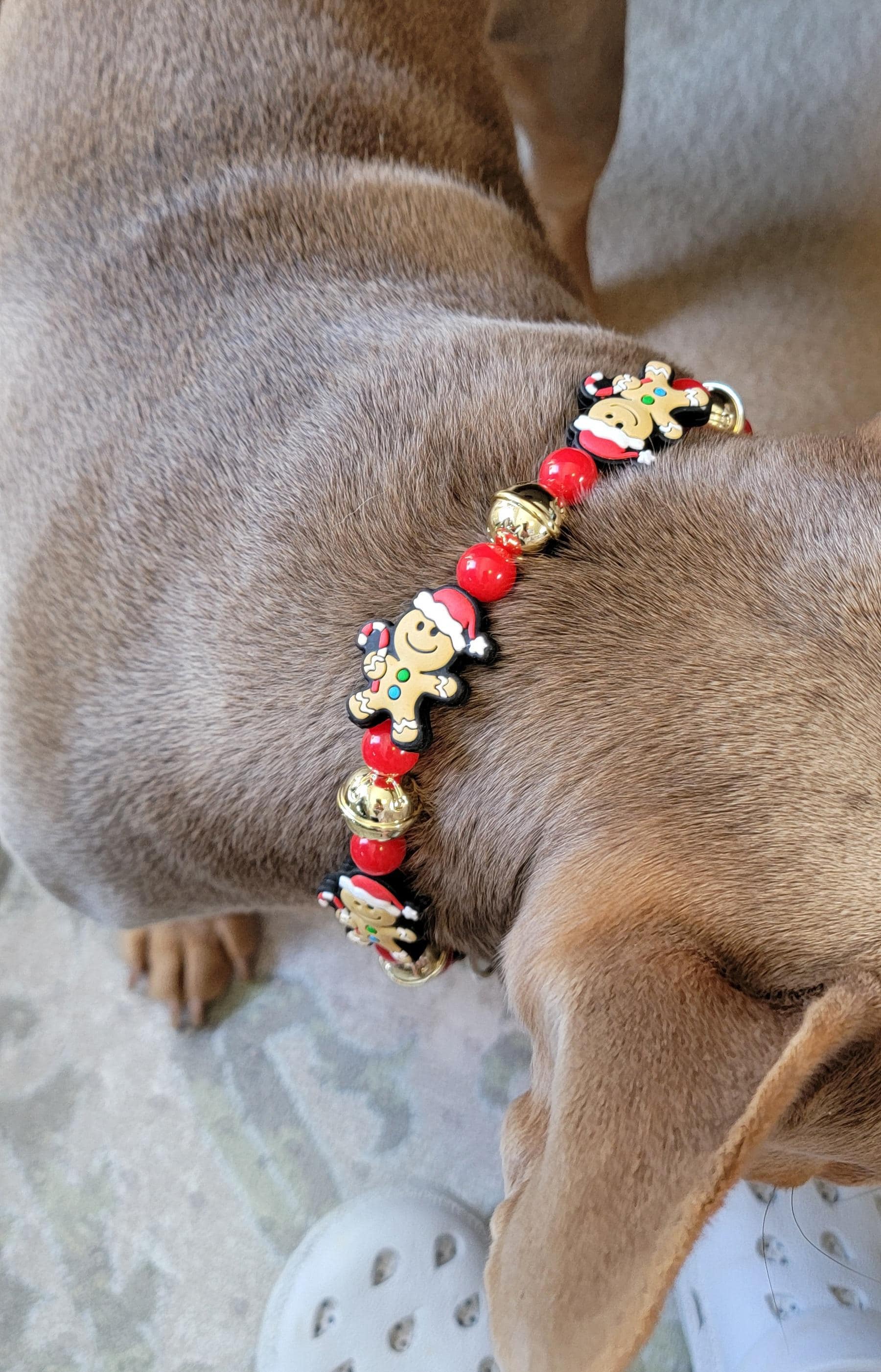 Bring the holiday spirit to your pup's wardrobe with this festive Gingerbread Man Christmas Dog Collar! Handmade with care, this cheerful beaded collar features adorable gingerbread men wearing Santa hats, bright red beads, and shiny gold jingle bells. Perfect for holiday walks, Christmas photos, or festive gatherings, this collar adds a touch of whimsy and joy to your dog's look.
