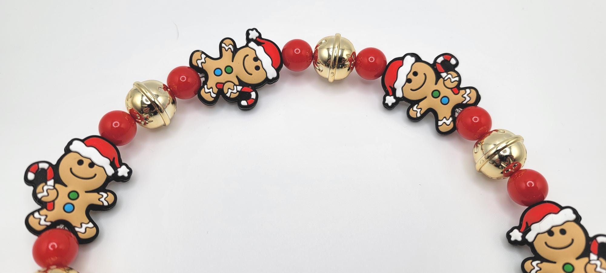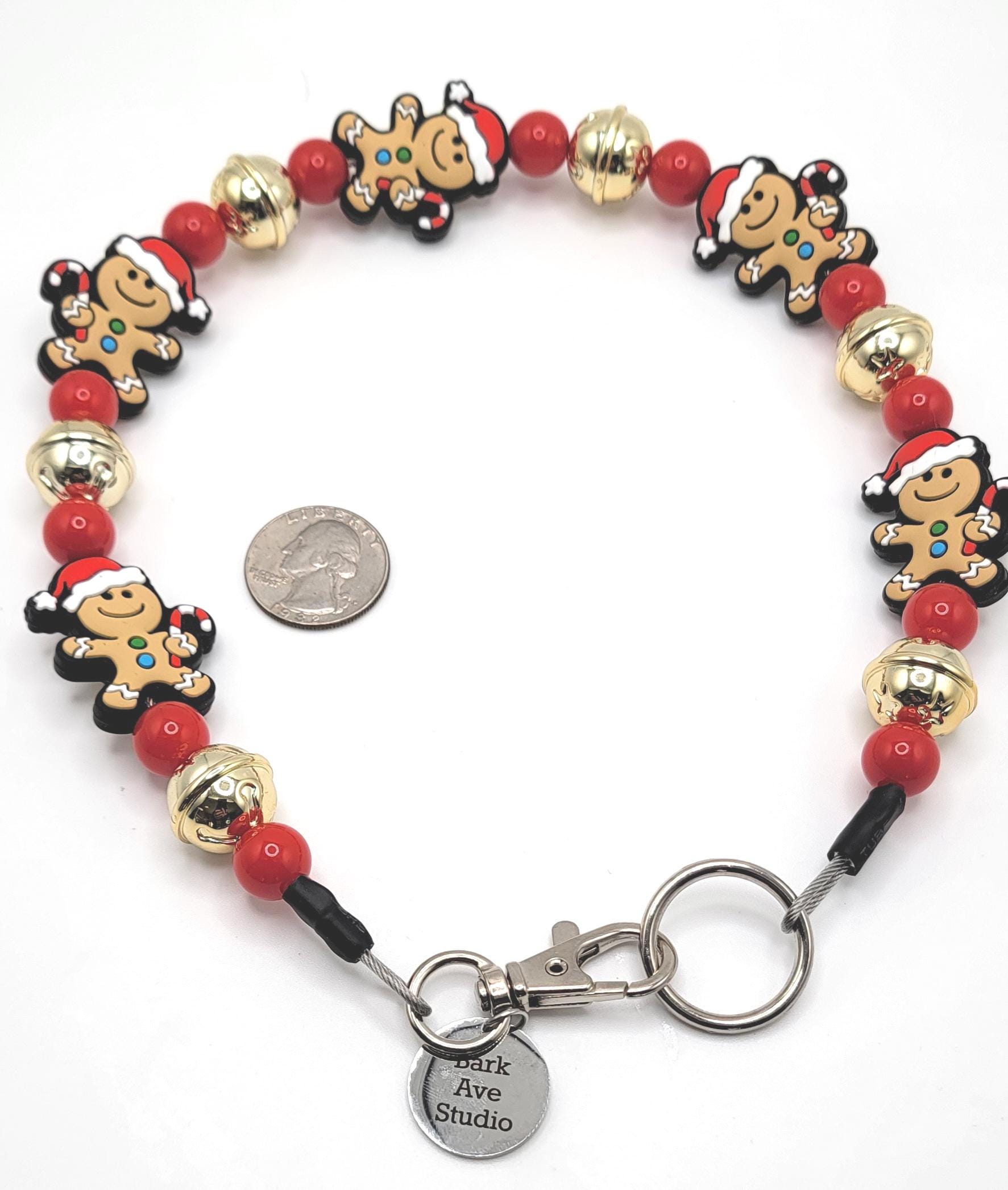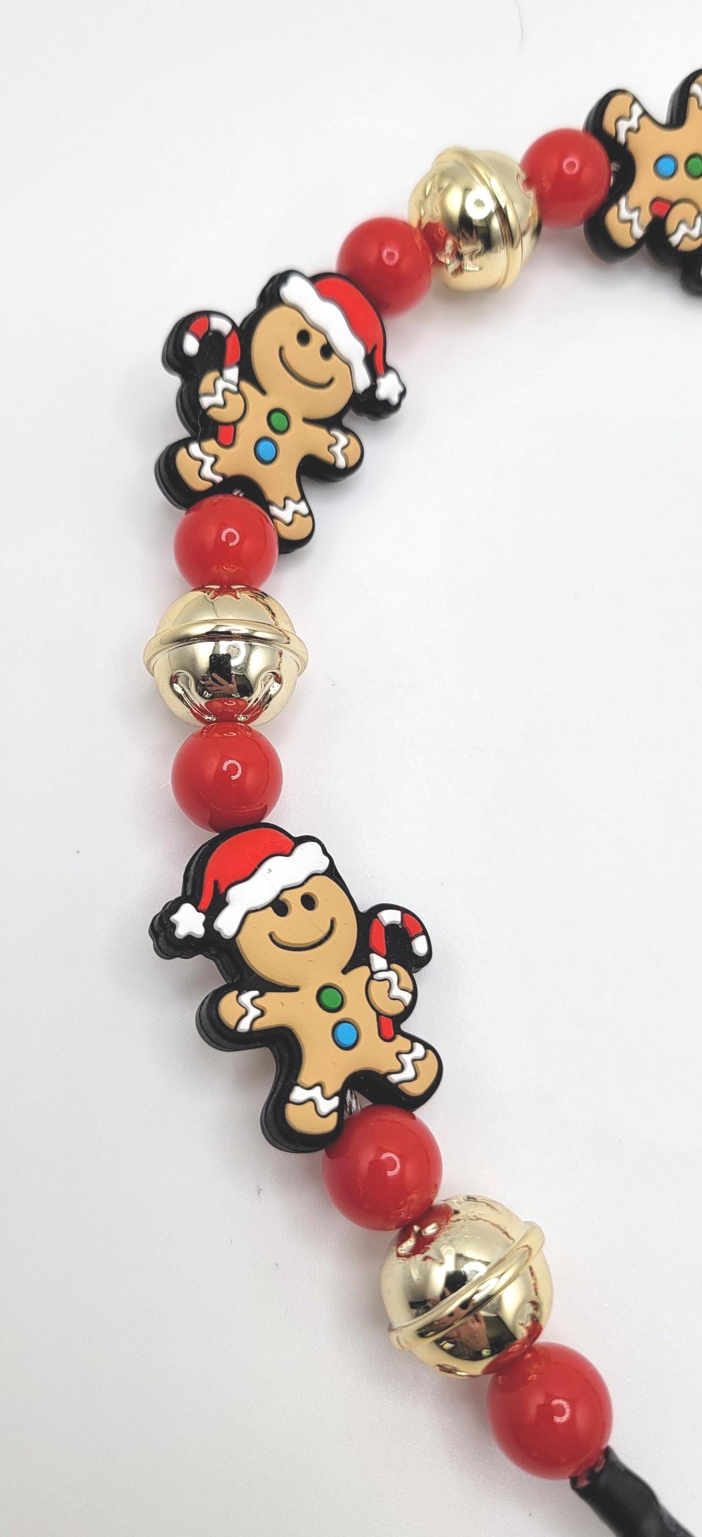 Bring the holiday spirit to your pup's wardrobe with this festive Gingerbread Man Christmas Dog Collar! Handmade with care, this cheerful beaded collar features adorable gingerbread men wearing Santa hats, bright red beads, and shiny gold jingle bells. Perfect for holiday walks, Christmas photos, or festive gatherings, this collar adds a touch of whimsy and joy to your dog's look.