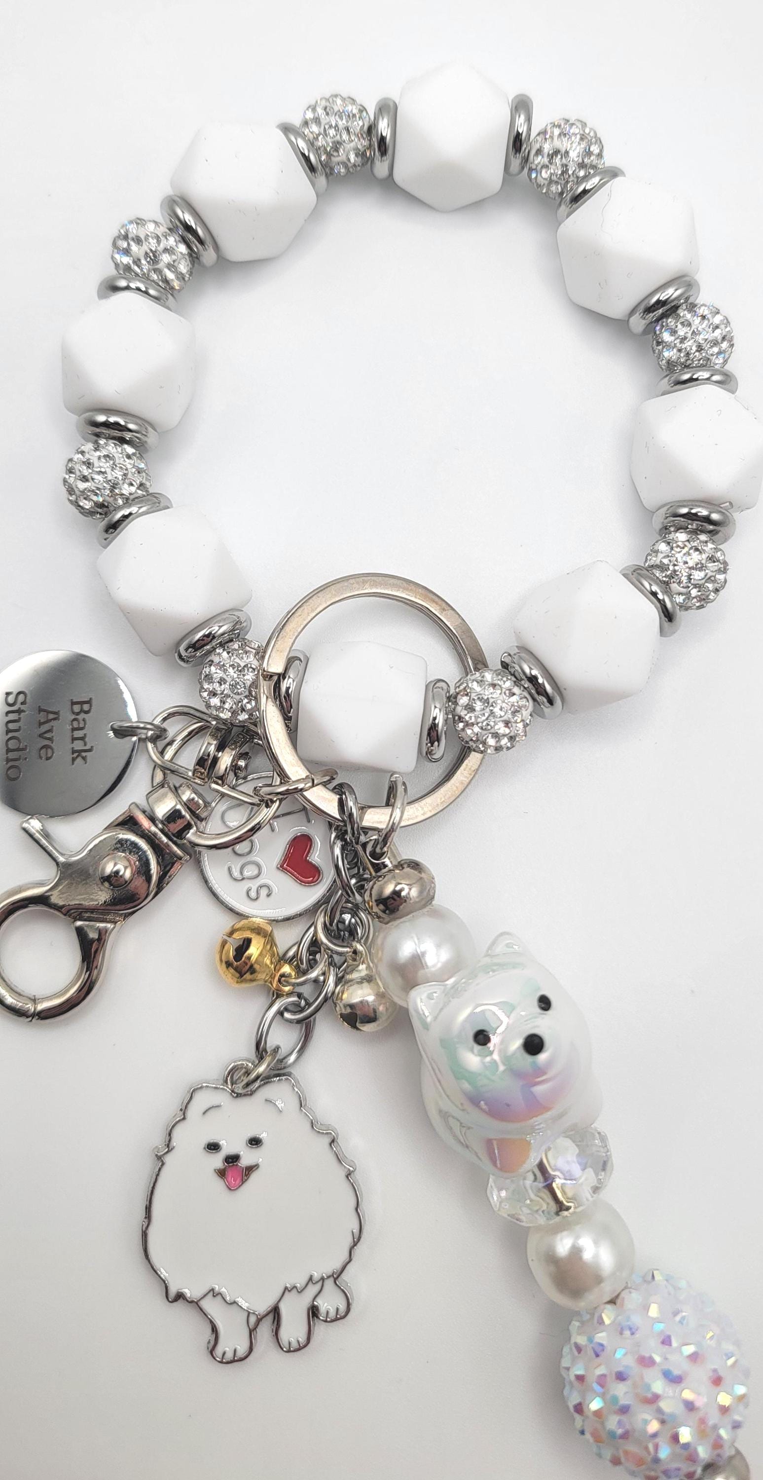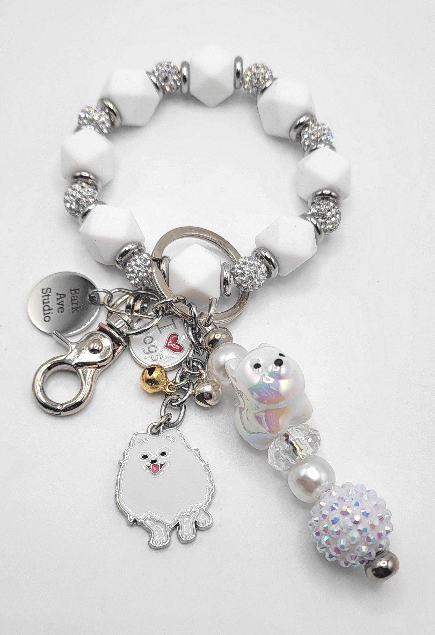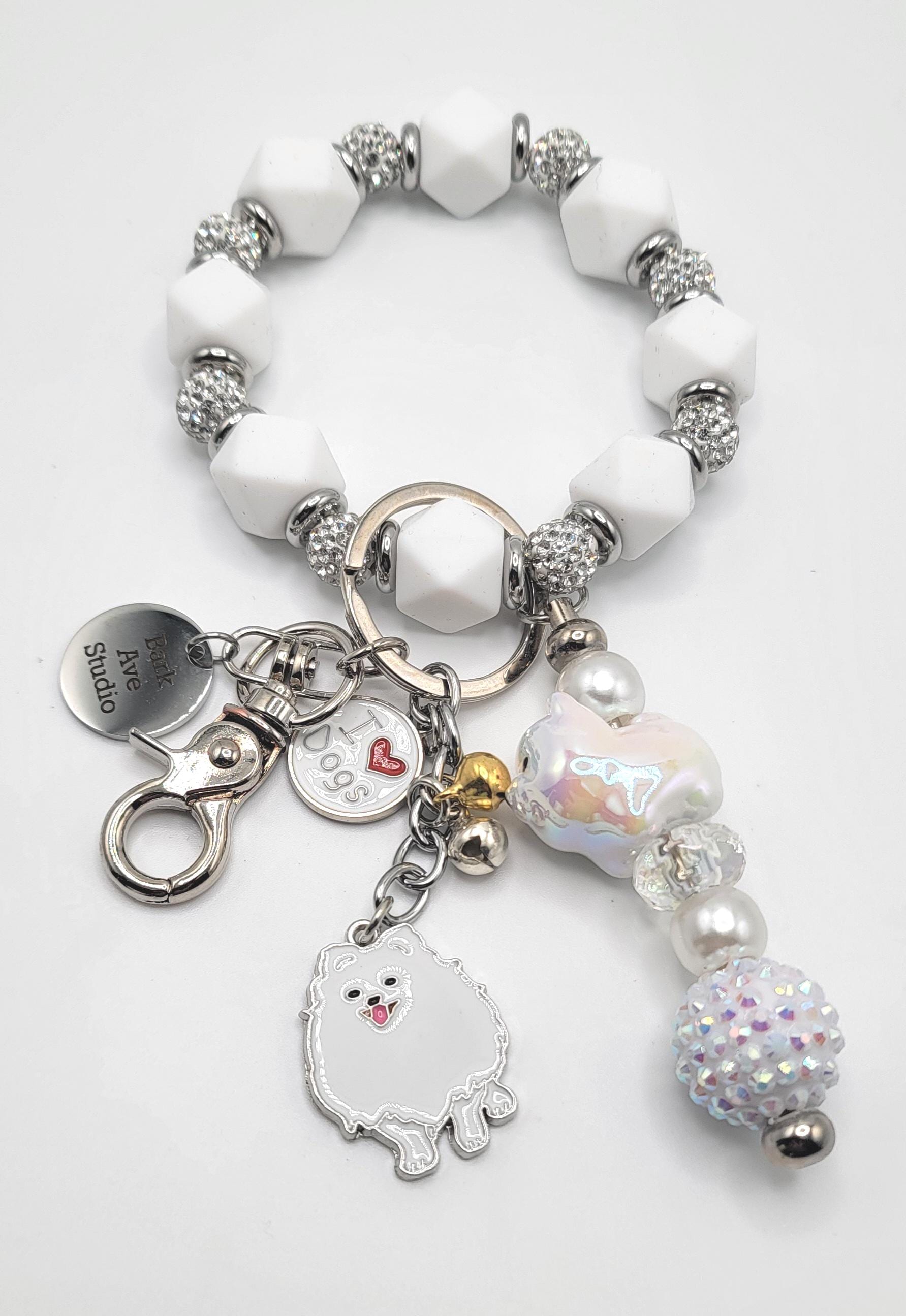 Never dig through your bag for your keys again! Carry a touch of sparkle and puppy love everywhere you go with this handcrafted beaded wristlet keychain from Bark Ave Studio. Designed with faceted white hexagon beads, shimmering rhinestone spacers, and a charming cluster of silver-tone charms- including a "Bark Ave Studio" tag, and "I Love Dogs" charm, and an adorable white Pomeranian pendant-this piece is perfect for dog lovers. The dangling accent bead features an iridescent pup with pearl and crystal-style beads for extra shimmer. Use it as a keychain, bag charm, or wristlet for your keys, leash, or small accessories. A delightful gift for Pomeranian owners, dog moms, or anyone who adores handmade, one-of-a-kind accessories.