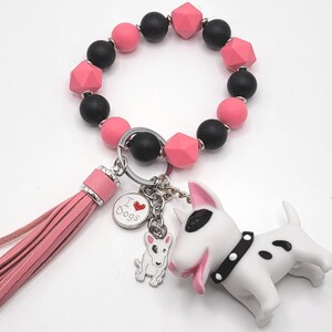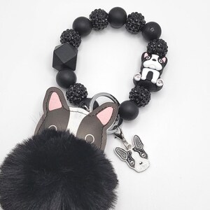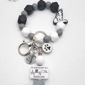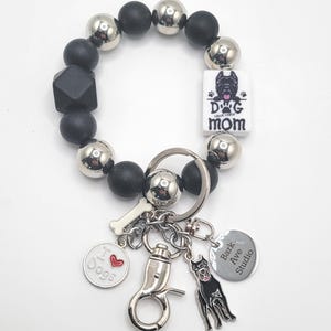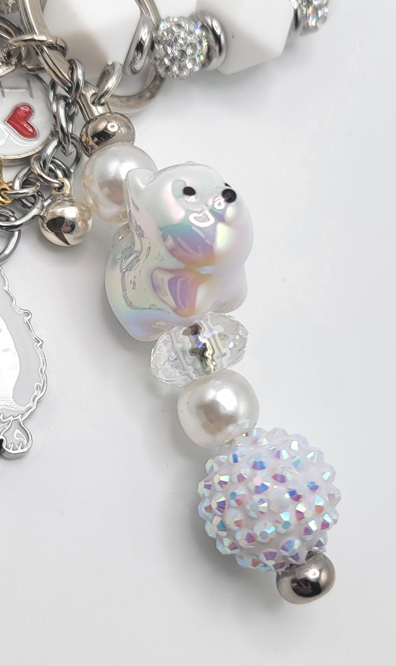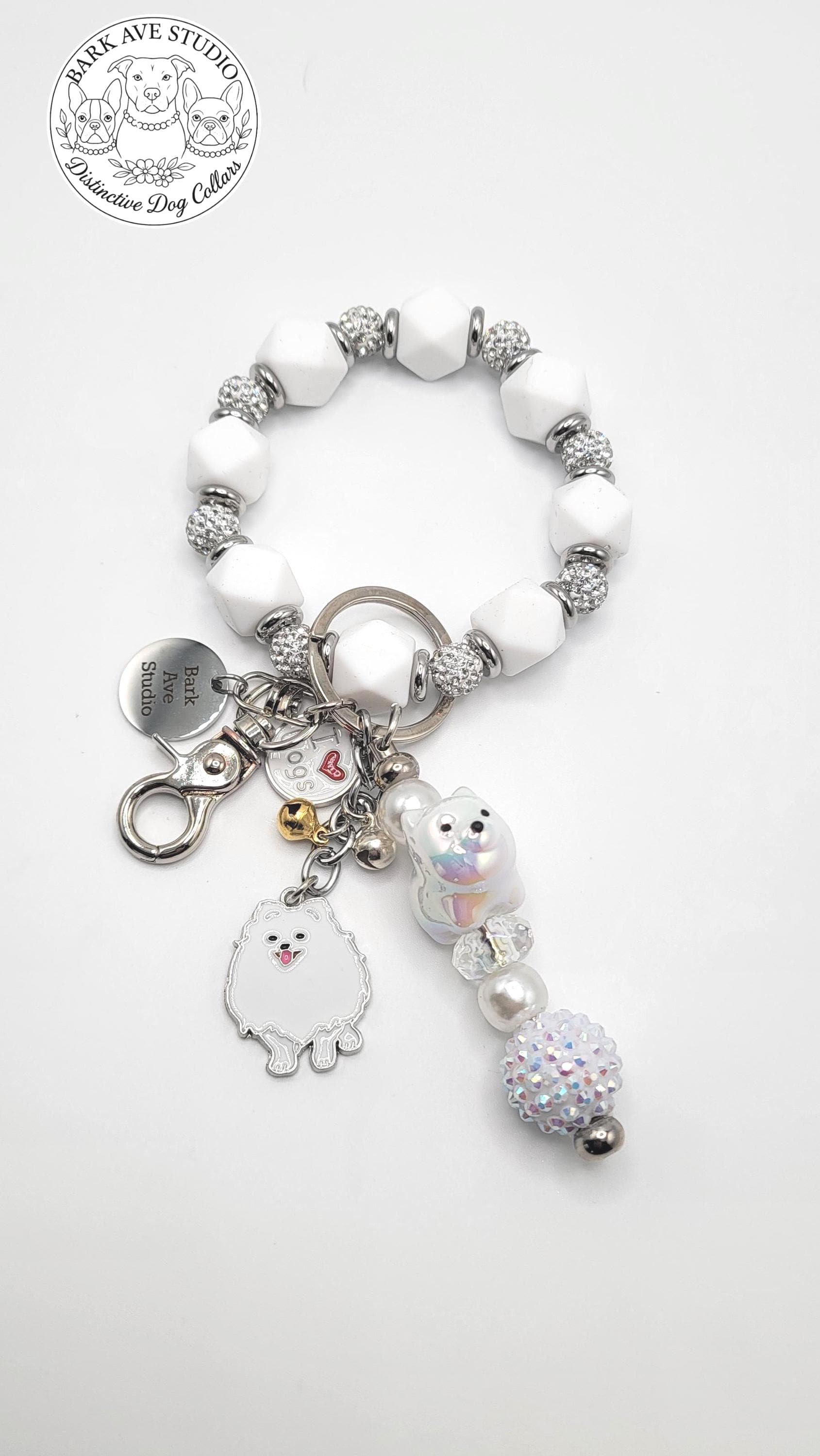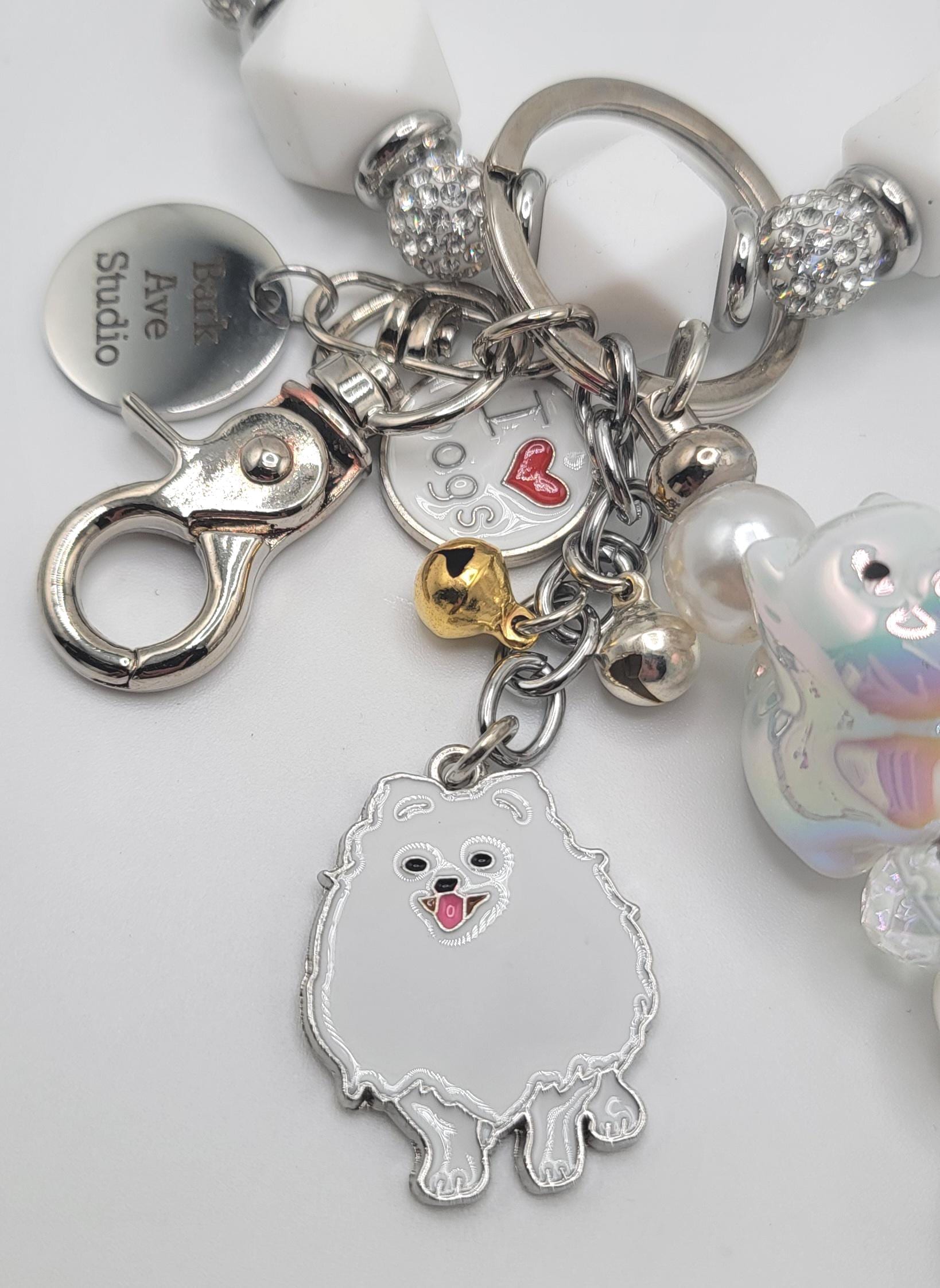 Never dig through your bag for your keys again! Carry a touch of sparkle and puppy love everywhere you go with this handcrafted beaded wristlet keychain from Bark Ave Studio. Designed with faceted white hexagon beads, shimmering rhinestone spacers, and a charming cluster of silver-tone charms- including a "Bark Ave Studio" tag, and "I Love Dogs" charm, and an adorable white Pomeranian pendant-this piece is perfect for dog lovers. The dangling accent bead features an iridescent pup with pearl and crystal-style beads for extra shimmer. Use it as a keychain, bag charm, or wristlet for your keys, leash, or small accessories. A delightful gift for Pomeranian owners, dog moms, or anyone who adores handmade, one-of-a-kind accessories.
