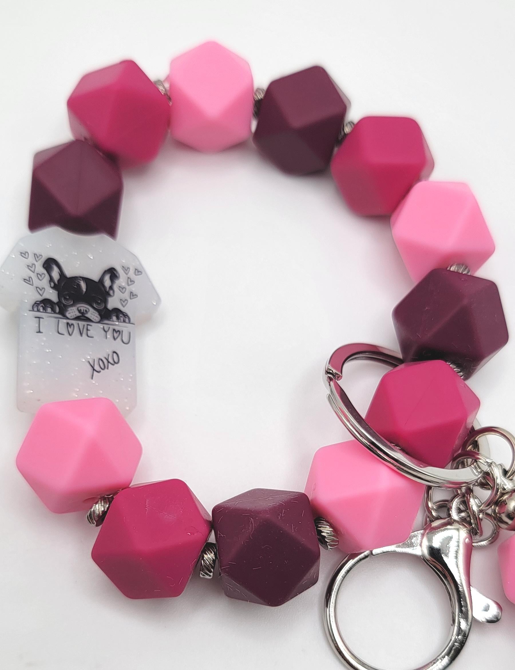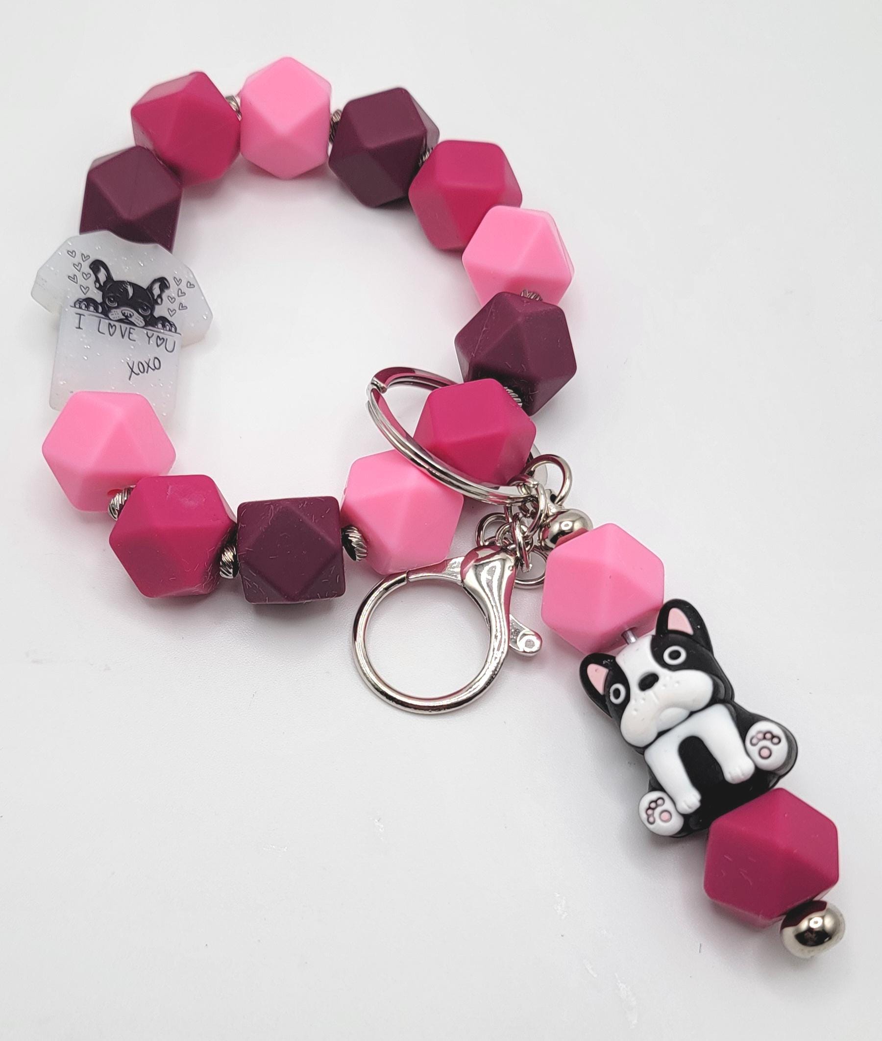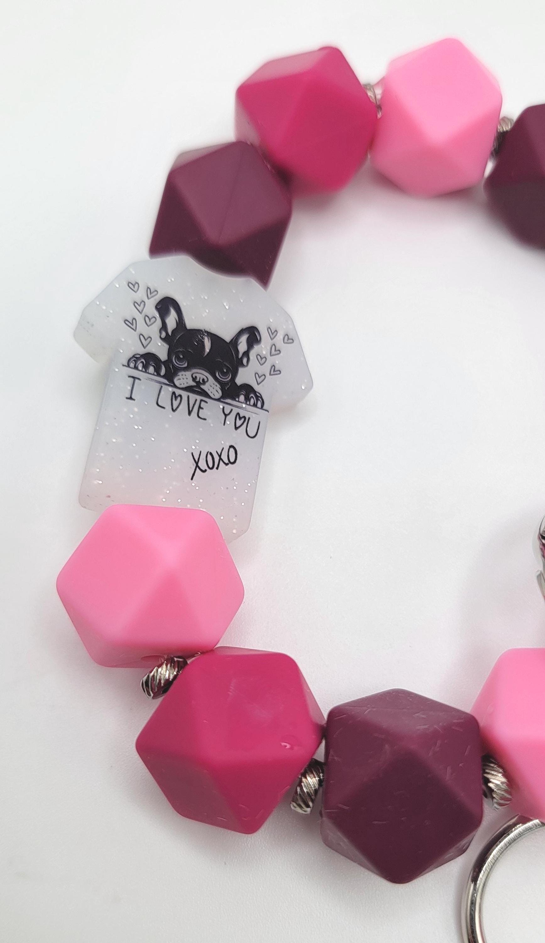 Show your puppy love everywhere you go with this adorable French Bulldog beaded wristlet keychain! Handmade with chunky geometric beads in rich plum, hot pink, and blush pink, this piece combines style and function. The charm features a sweet French Bulldog paired with a glittery mini-T-shirt charm that says "I Love You XOXO" - the perfect touch for any dog lover or pet parent. Attach it to your keys, purse, or tote bag for a pop of color and personality. The durable stainless-steel clasp makes it easy to clip on and go. Makes a thoughtful gift for French Bulldog moms, Valentine's Day, birthdays, or anyone who can't resist a cute pup!