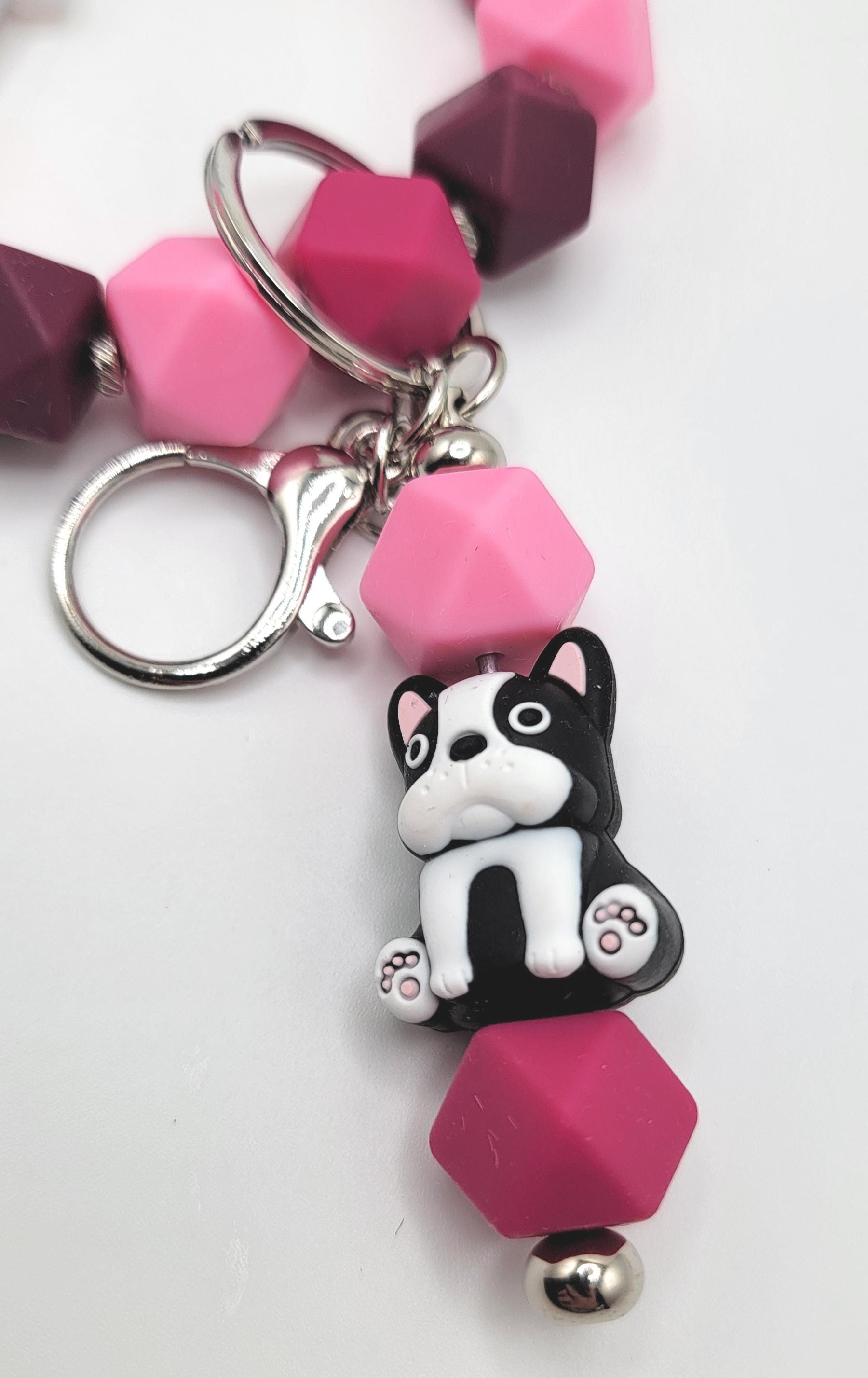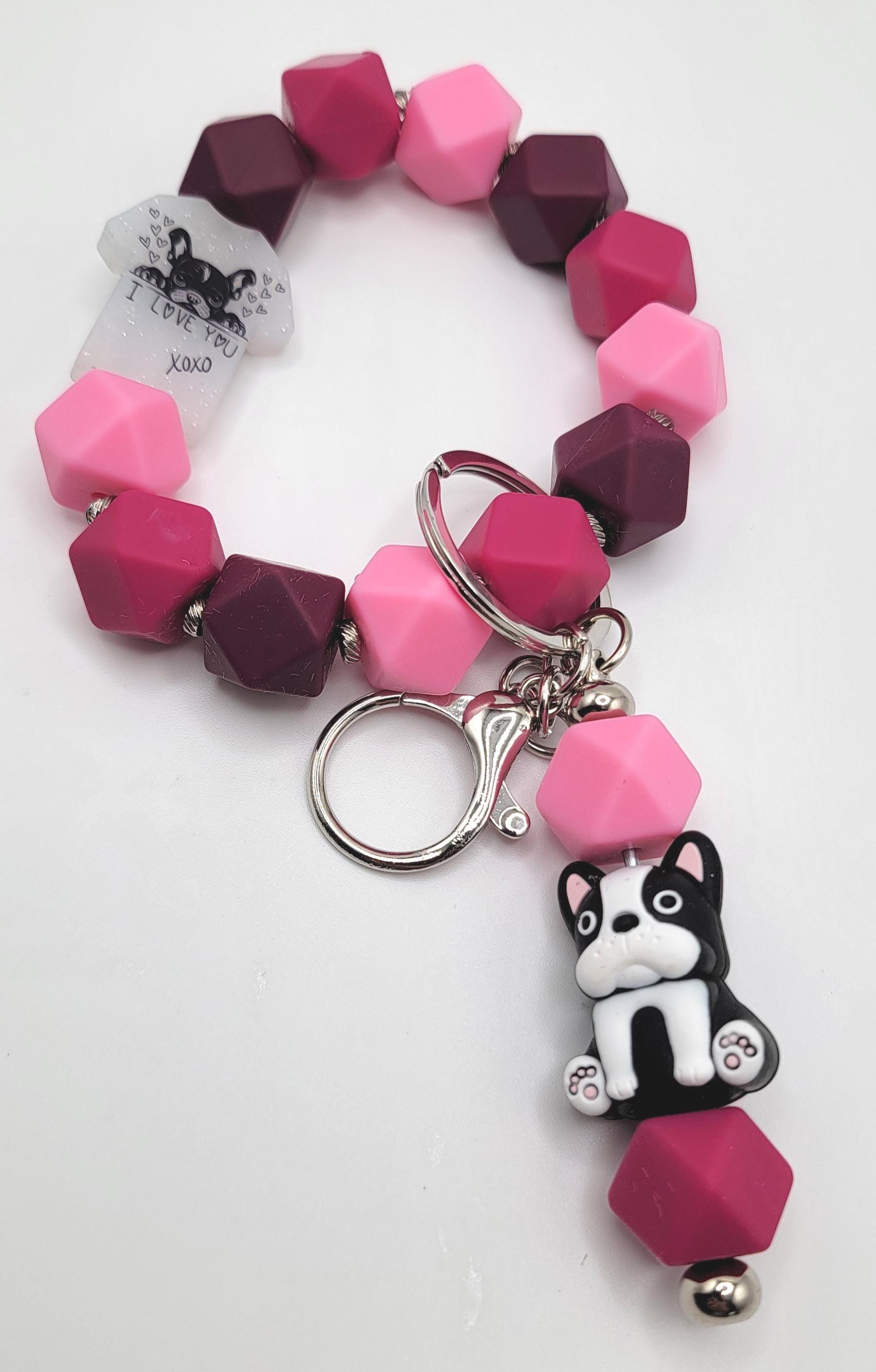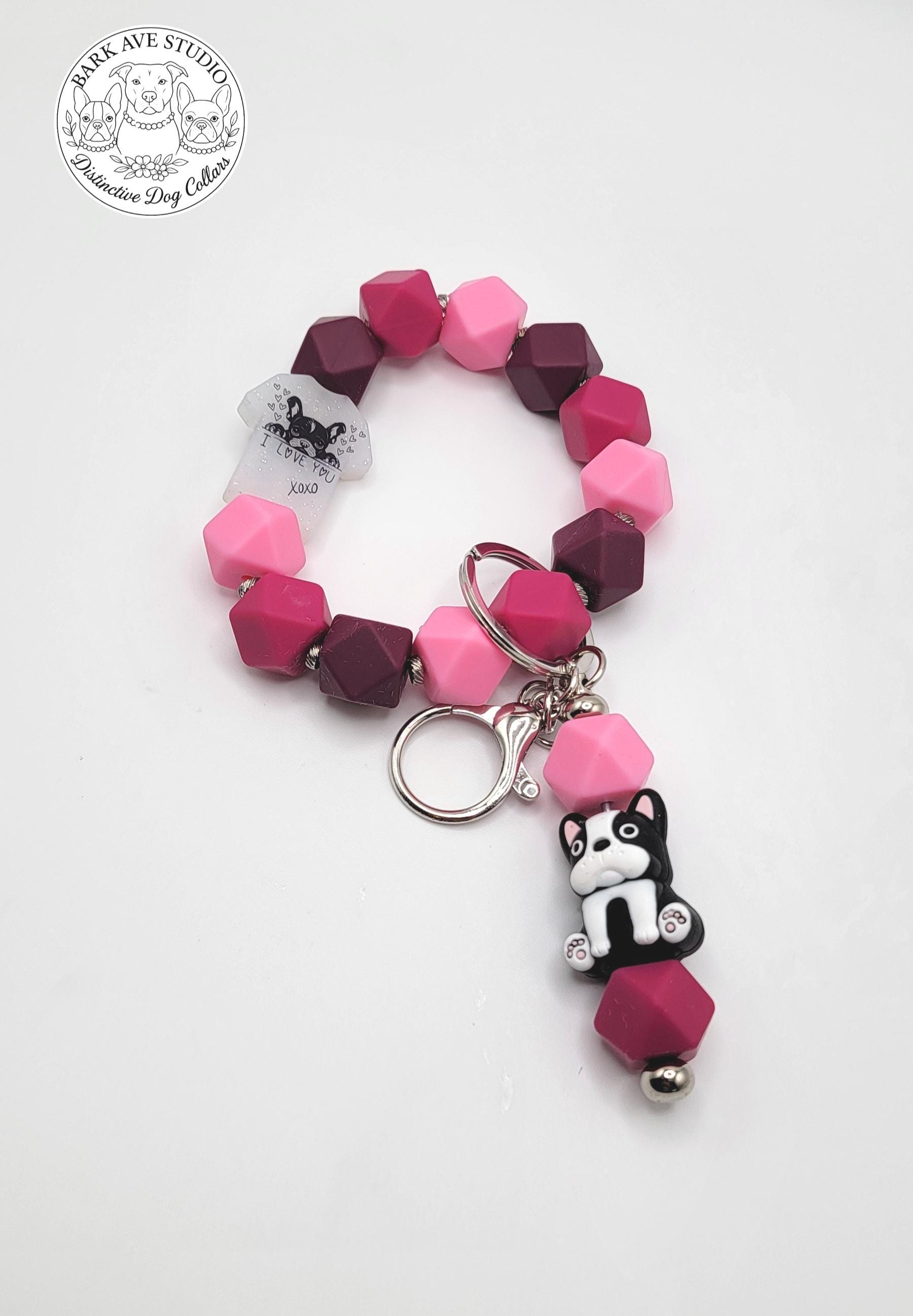 Show your puppy love everywhere you go with this adorable French Bulldog beaded wristlet keychain! Handmade with chunky geometric beads in rich plum, hot pink, and blush pink, this piece combines style and function. The charm features a sweet French Bulldog paired with a glittery mini-T-shirt charm that says "I Love You XOXO" - the perfect touch for any dog lover or pet parent. Attach it to your keys, purse, or tote bag for a pop of color and personality. The durable stainless-steel clasp makes it easy to clip on and go. Makes a thoughtful gift for French Bulldog moms, Valentine's Day, birthdays, or anyone who can't resist a cute pup!