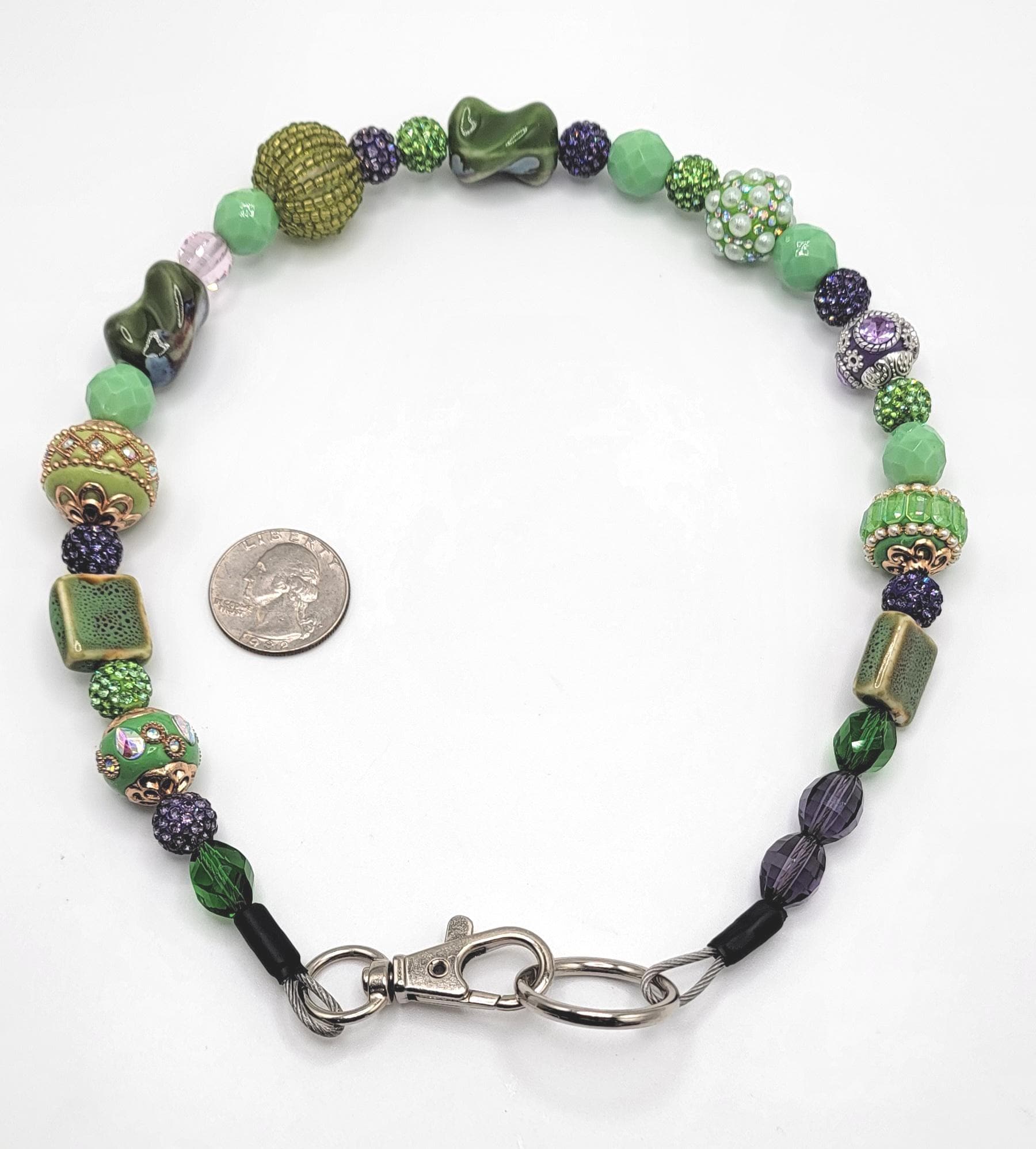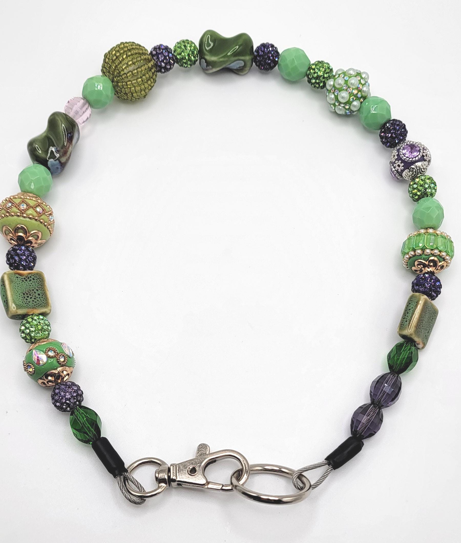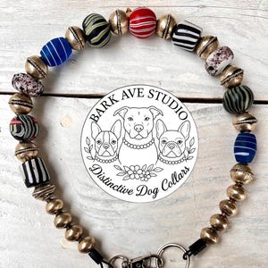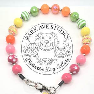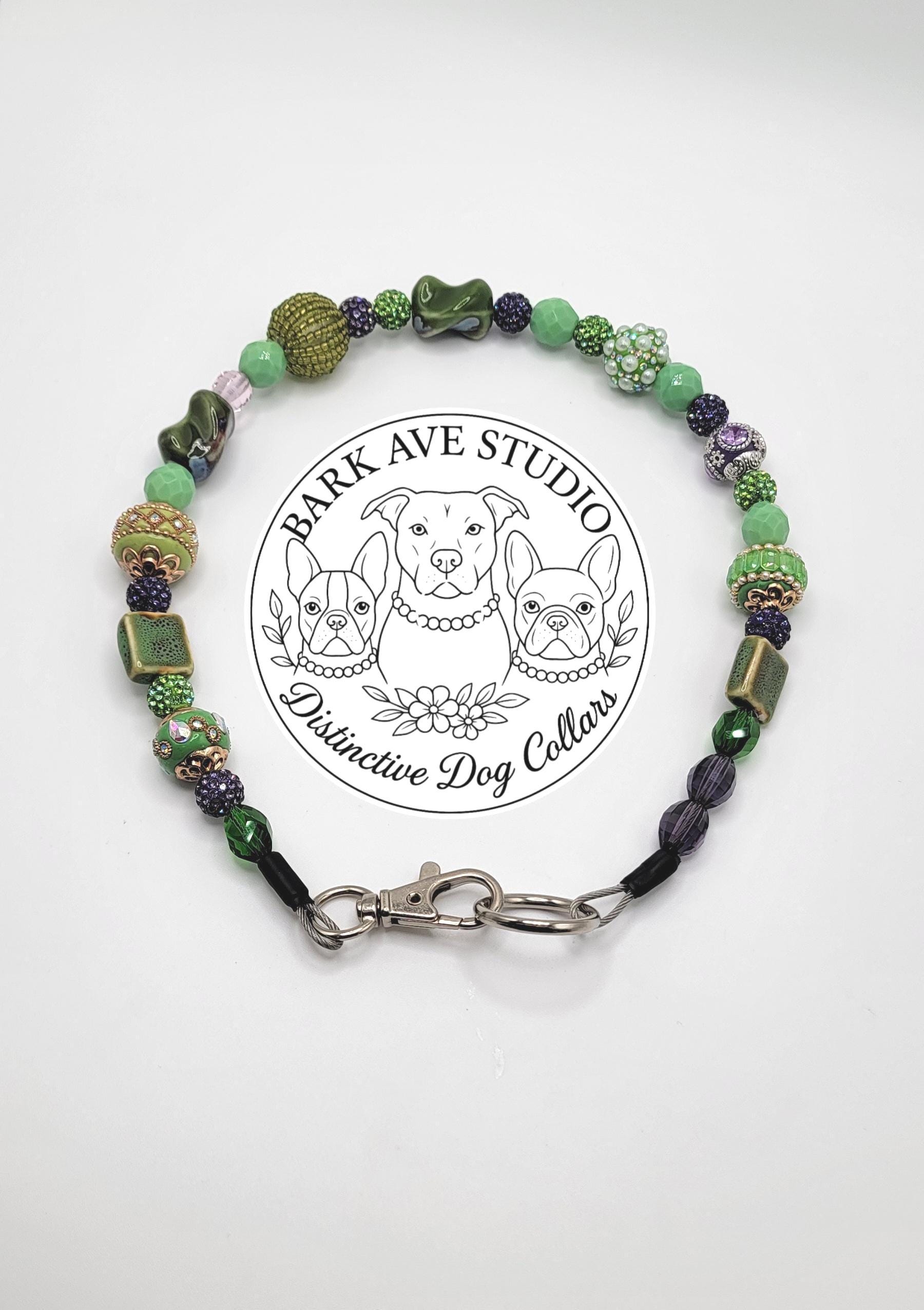 Celebrate your pup’s vibrant spirit with this one-of-a-kind Mardi Gras-inspired dog collar from Bark Ave Studio! Featuring hand-selected beads in shimmering shades of green, purple, and gold, this distinctive dog necklace adds a festive, playful touch to your dog’s style. Every bead is carefully chosen for maximum sparkle and character, including floral ceramics, glitter rounds, rhinestone-studded gems, and bright neon accents.